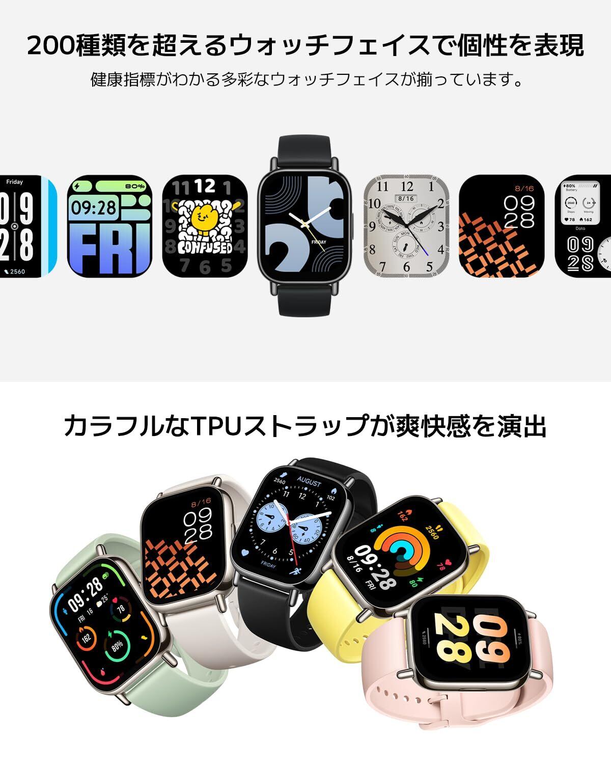【1.96インチの大型有機ELディスプレイ】1.96インチの鮮明な有機ELディスプレイで、豊かで自然な色を再現。ディスプレイは75.8%の画面占有率を誇ります。AOD(常時画面表示)機能にも対応しており、一日中質の高い体験を提供します。スクエアディスプレイは、光沢度の高いNCVMミドルフレームを使用し、スタイリッシュで軽量設計でワークアウトにぴったりです。