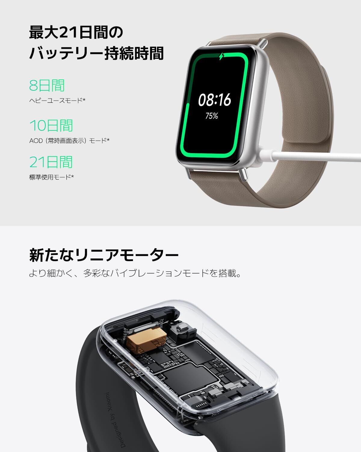【最大21日間の長時間バッテリー持続と最短75分でフル充電可能】低消費電力センサーと大容量バッテリーを搭載し、スマートにバッテリー効率を管理することで、標準使用で最大21日間の駆動時間を実現しました。また、最短75分でフル充電をすることが可能です。