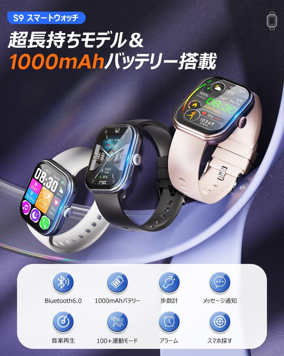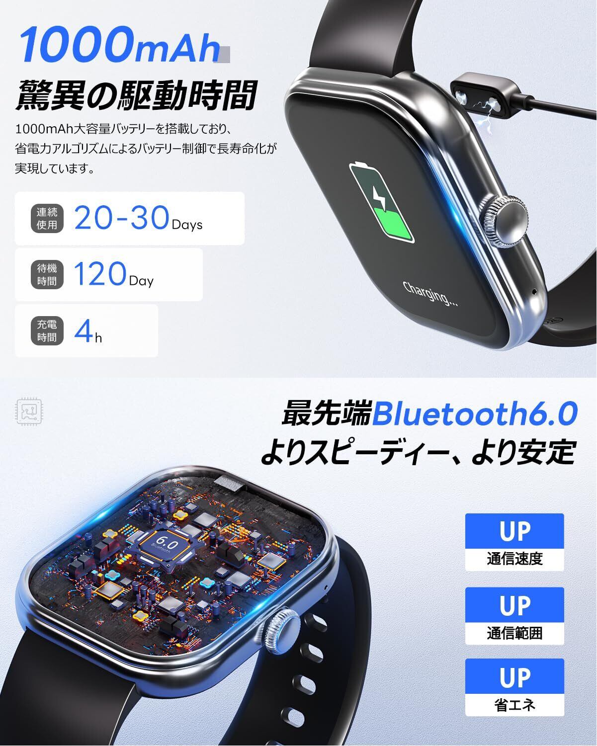 【長持ちバッテリー 搭載 Bluetooth6.0通話機能】当社のスマートウォッチには業界をリードする1000mAh超大容量バッテリーを内蔵し、業界初の超省電力AIアルゴリズムを採用し、力を最小限に抑えますフルー充電すると最大30日間の連続使用可能であり、最大120日間スタンバイできます。そのため、頻繁に充電する必要がなく、旅行や短期出張の際に電池切れを心配する必要がありません。(※使用頻度、使用方法等によりバッテリーの消耗が早くなる場合があります。)従来の5.3より、Bluetooth6.0搭載の該当スマートウォッチは安定性が飛躍的に向上され、高速なデータ伝送を実現します。アプリでスマートウォッチとペアリングするだけで、電話かける/受けることができます。マイクとHi-Fiスピーカーが内蔵されでおり、このスマートウォッチは直接に通話することもできます。