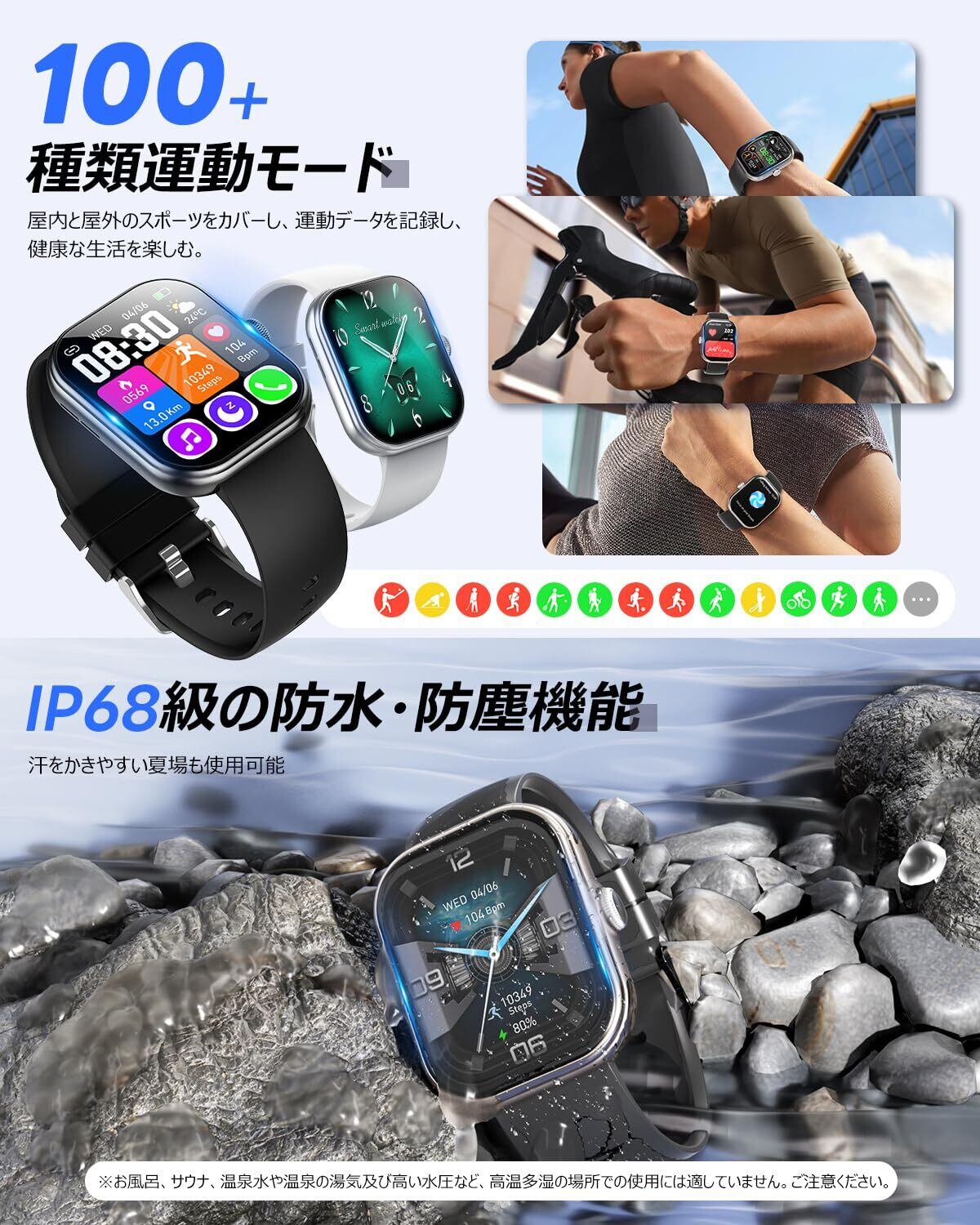【文字盤&画面DIY IP68防水】本体に6文字盤を搭載しているほか、アプリは60種類以上の文字盤が搭載され、ビジネス、通学や日常生活など、どんなシーンでも使用できます。アプリで「AIウォッチフェイス」があり、写真を撮って独特なAIウォッチフェイスが作りましょう。それとも恋人、アイドル、家族の写真はお好きにウォッチ顔にも設定できます。または自分の好きな写真を文字盤としてカスタマイズできます。IP68級ハイレベル防水及び防塵性能を持っており日常生活の手洗いや洗顔の際はもちろん、汗だくのトレーニングと雨の日にも気にせずに使用できます。※お風呂、サウナ、温泉水や温泉の湯気及び高い水圧など、高温多湿の場所での使用には適していません。ご注意ください。