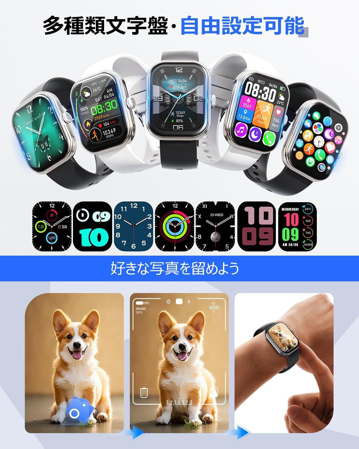 【2.01インチ大画面 保護フィルム付き】2.01インチのカラースクリーンを搭載されし、240*296ピクセル高精度な大画面で通知や文字が一目瞭然に表示される。画面の明るさ調節も可能で、強い日差し下にも視認性が高く、見やすいです。本製品にはTPU素材の保護フィルムが付属しています。超薄、光の高透過率で、画面るに最高レベルの保護を施しながら、保護フィルム自体の存在感がなくて、上品でエレガントな印象を与えます。柔らかいTPU素材を採用しており、弾力性と柔軟性を持っている。傷が自動的に修復する機能を備え、傷が発生しても自動的に修復し、きれいに戻ります。通常フィルムを貼り付けときの気泡は1-2日で自然消滅したので、経験がなくても気泡に悩まされず。スマートウォッチのセンサーの傷は本体の傷ではなくて、保護用シールがありますので、剝がしますがよろしいです。