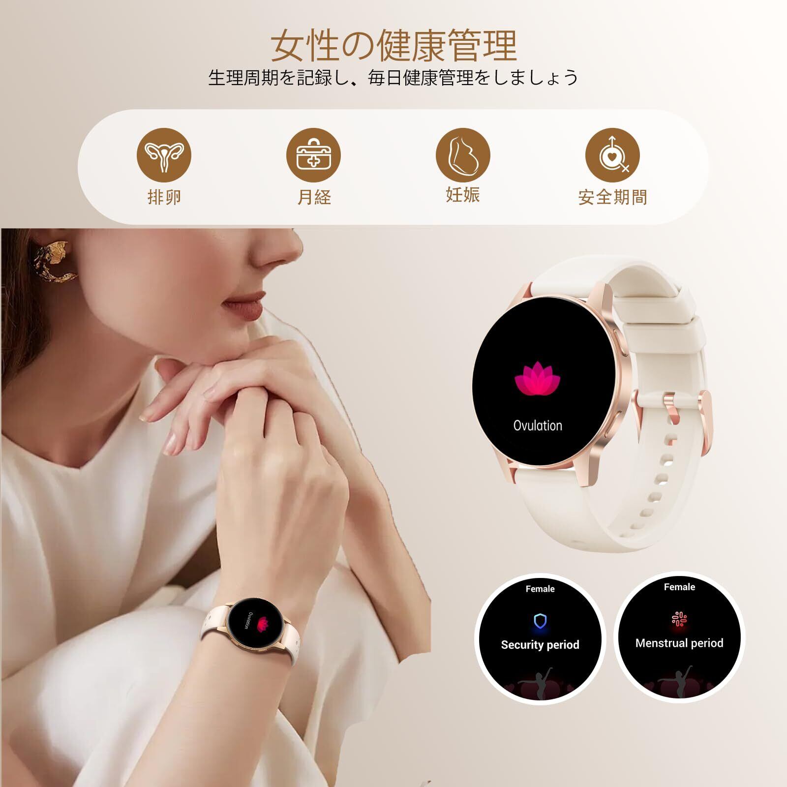 【女性の健康ニーズに焦点を当てた】: この女性向けスマートウォッチは、高度で高精度のセンサーを使用して、心拍数と睡眠をリアルタイムで記録し、24 時間体制の専門的な健康モニタリングをサポートします.内蔵の女性向け健康機能により、接続した「Fit Cloud Pro」アプリから関連データの分析やライフスタイルの調整を確認できます.女性の月経状況を記録し、月経周期カレンダーを管理できるほか、インテリジェントアルゴリズムにより月経や排卵を予測できるため、妊娠準備や出産に役立ちます.