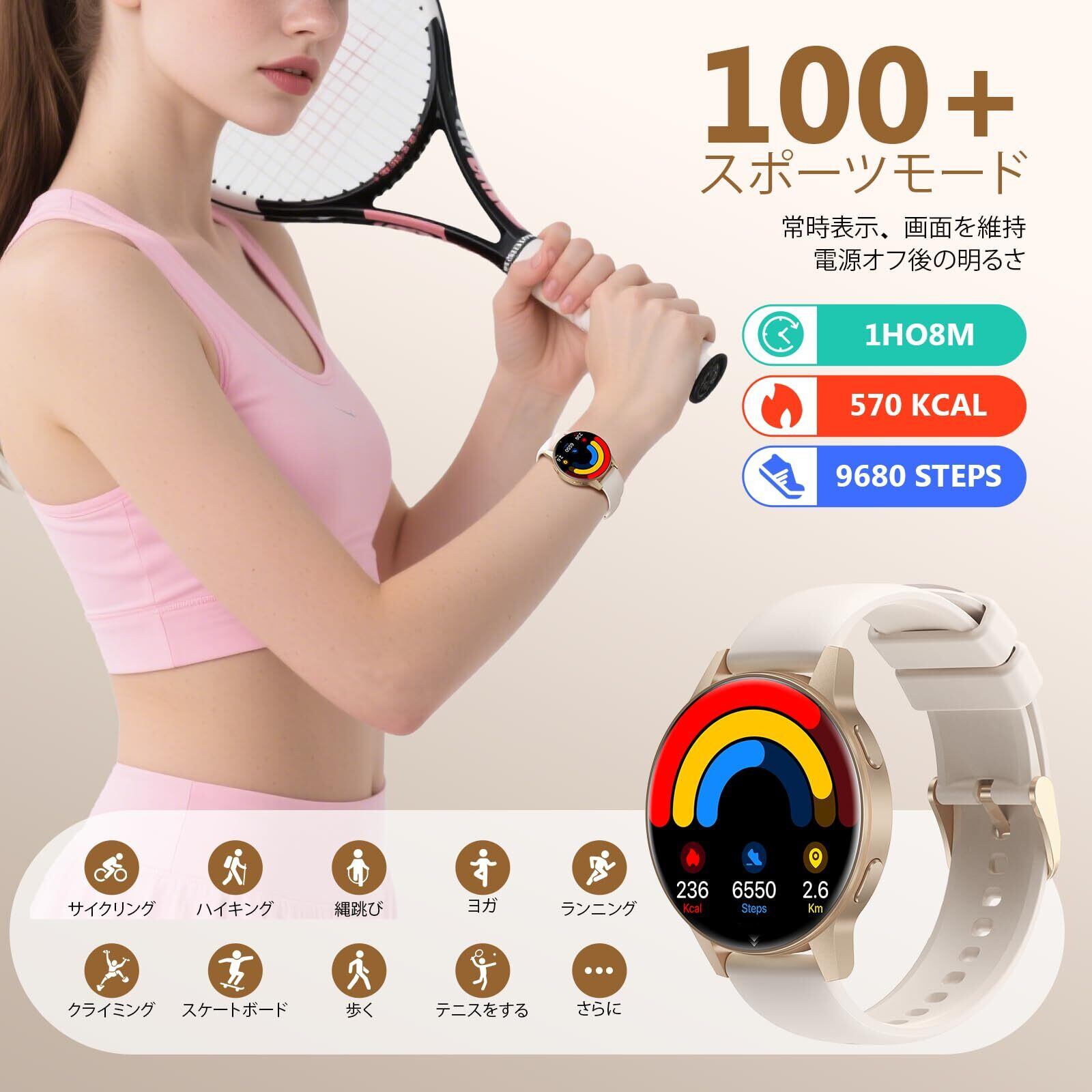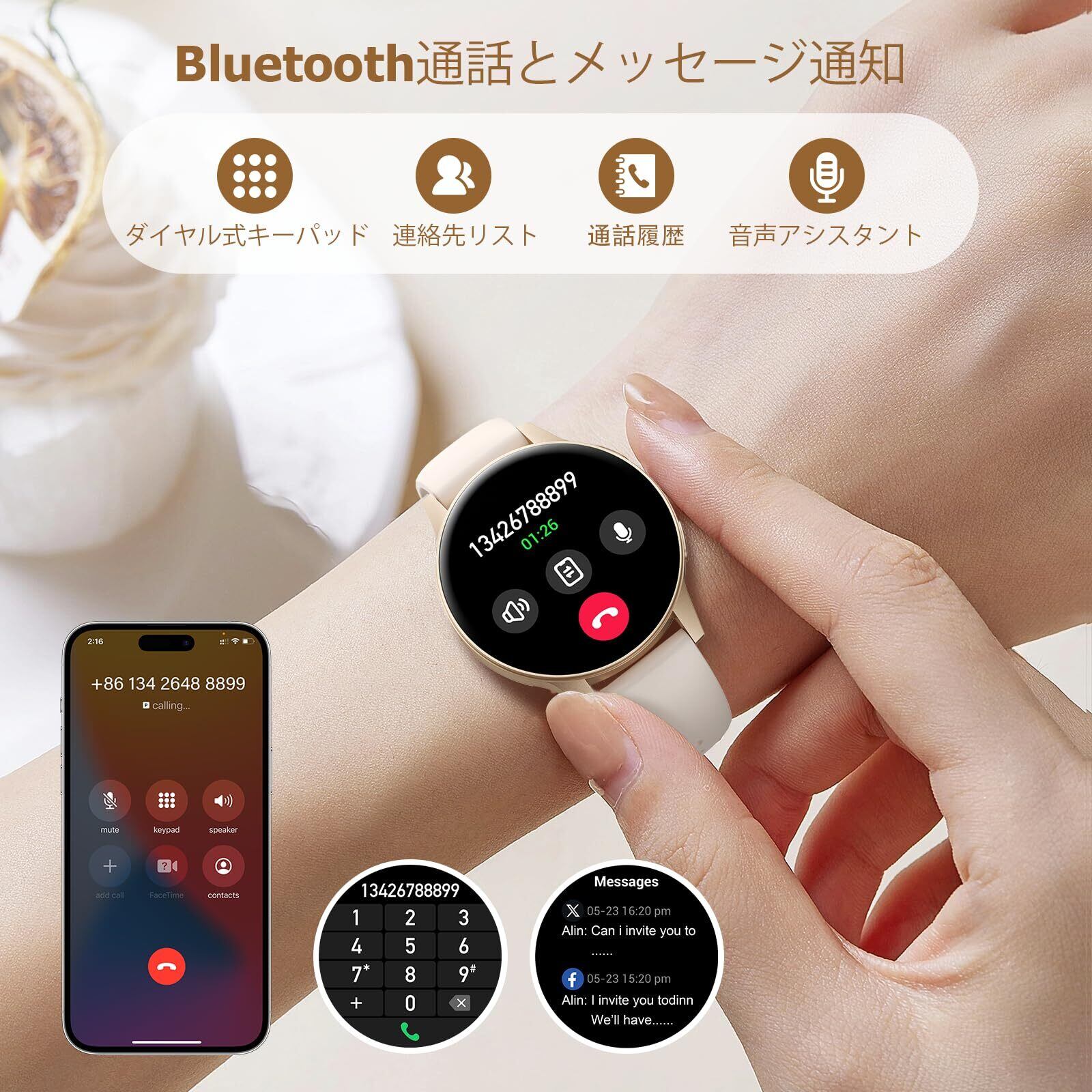 スマート ウォッチ【2025年 新モデル・超薄型・超軽量】 iPhone対応 アンドロイド対応 丸型 1.27インチ 通話機能 通話通知 活動量計 腕時計 IP68防水 100種類運動モード 文字盤切替 音楽再生 スポーツウォッチ 天気予報 カメラ操作 心拍数測定 スポーツ'スマートウォッチ レゼントに最適 (ベージュ)
