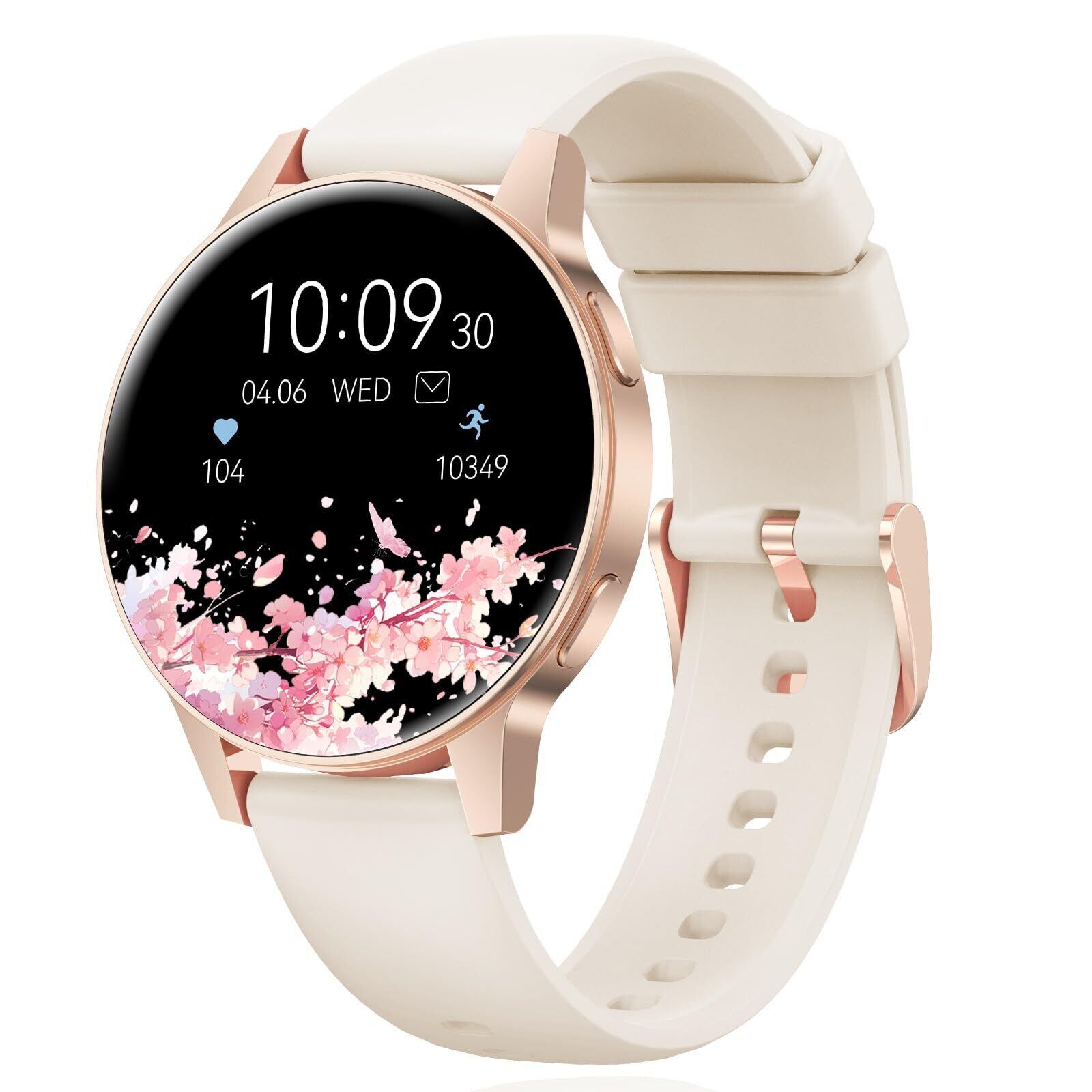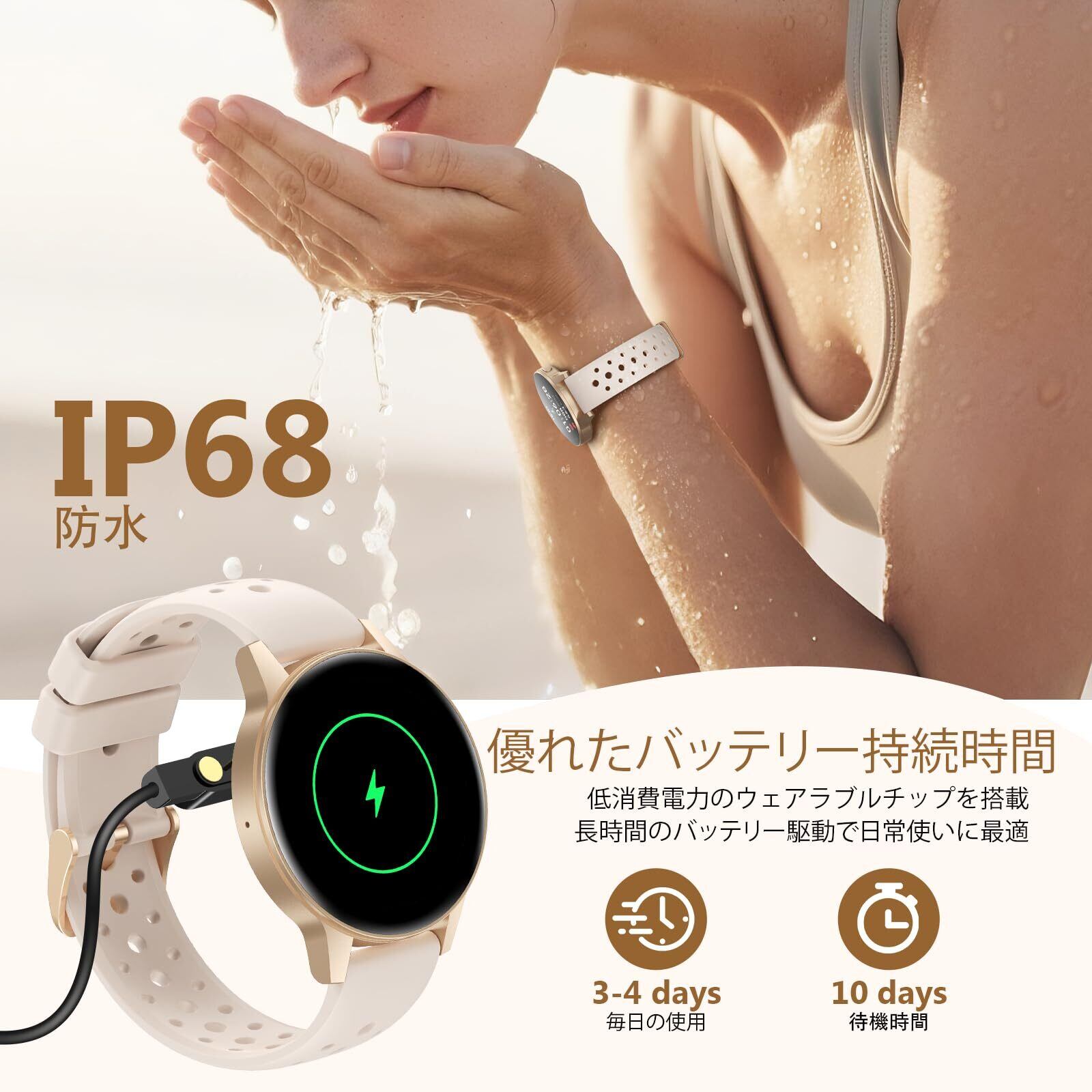 女性向けBluetoothスマートウォッチ。1.27インチTFTタッチスクリーン(360x360ピクセル)、パーソナライズされたウォッチフェイスデザイン。24時間心拍数、睡眠モニター、歩数計、水分補給リマインダーといった基本的な健康機能を搭載。280mAhバッテリー、マグネット充電、2.5時間でフル充電。IP68防水規格。使いやすく、プラグアンドプレイ。Android 5.0 / iOS 8.0以上に対応。便利なデイリーアシスタント、着信通知、天気アプリ、目覚まし時計、Bluetoothによるスマホ探し機能も搭載。