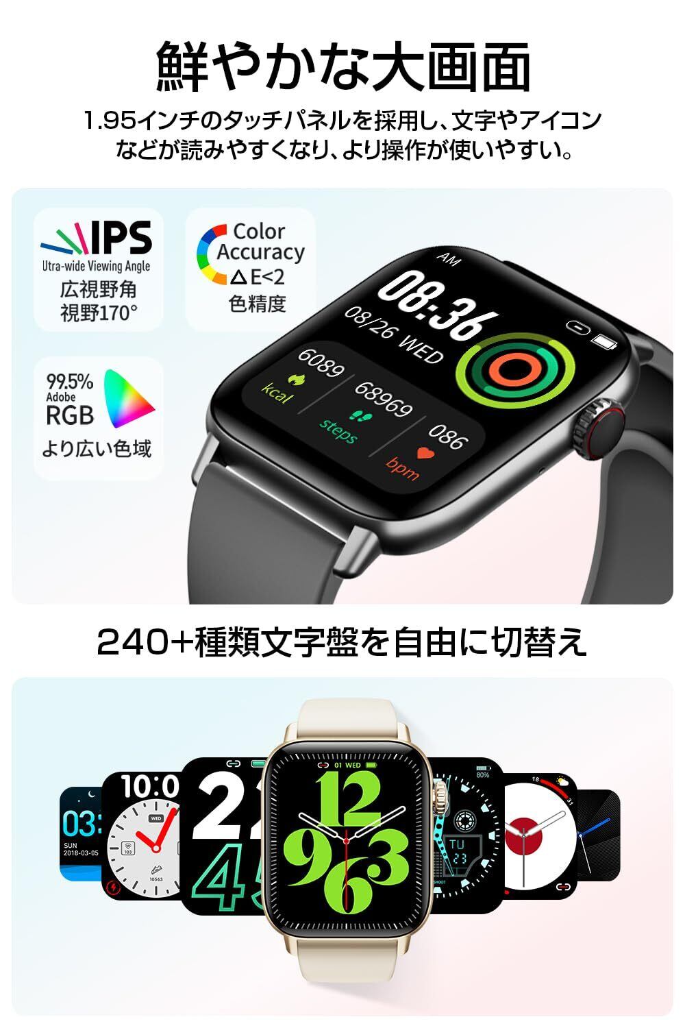 【個性的でおしゃれな大画面 鮮明で自由な表示】 1.95インチの超高精細大画面を搭載し、高解像度により、細部まで質感のある表現と豊かな色彩を実現。文字盤は約240枚の文字盤デザインに加えて、お気に入りの写真を使ってカスタマイズも可能です。「腕上げ点灯」機能により、ボタン操作は不要、手首を上げるだけで時刻やメッセージ、健康データが即時に表示され、必要な情報を素早く確認できます。