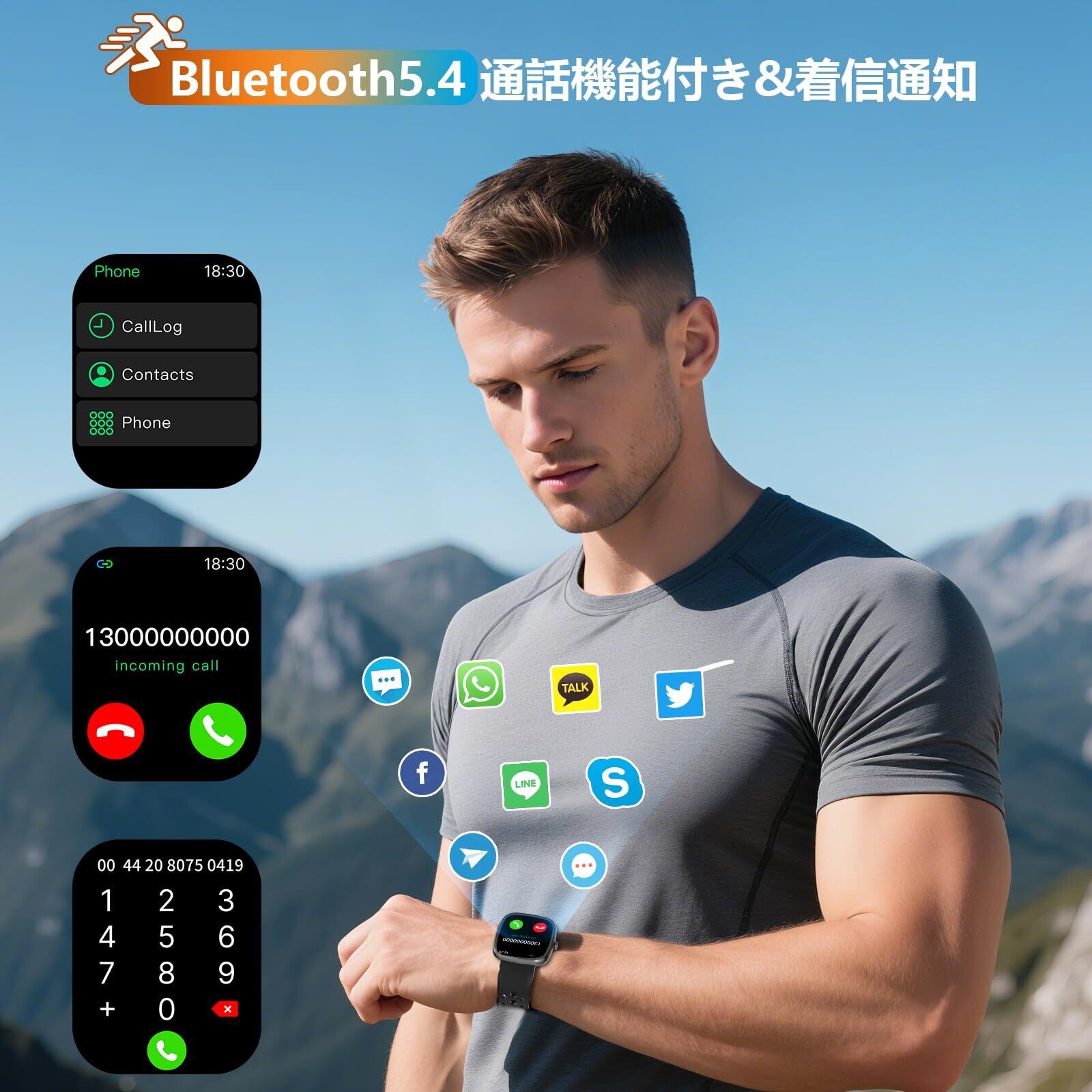 【最先端のBluetooth5.4通話機能&便利な通知機能】業界最先端Bluetooth5.4を採用で、従来のスマートウォッチの通信問題を大幅に改善され、電池寿命・通信速度・通信範囲・接続の安定性も大幅に向上されました、省エネ性もが強化されています。専用アプリと接続するとスマートウォッチで直接に電話をかけることや着信拒否も実現可能。電話の連絡先を同期したり、通話履歴を表示したりすることができます。スマートウォッチは専用アプリとペアリングし、Line、Twitter、Ins、Facebook、Instagram、着信などの通知は、全部バイブレーションで通知されます。一切の大事な連絡を絶対に見逃しません。