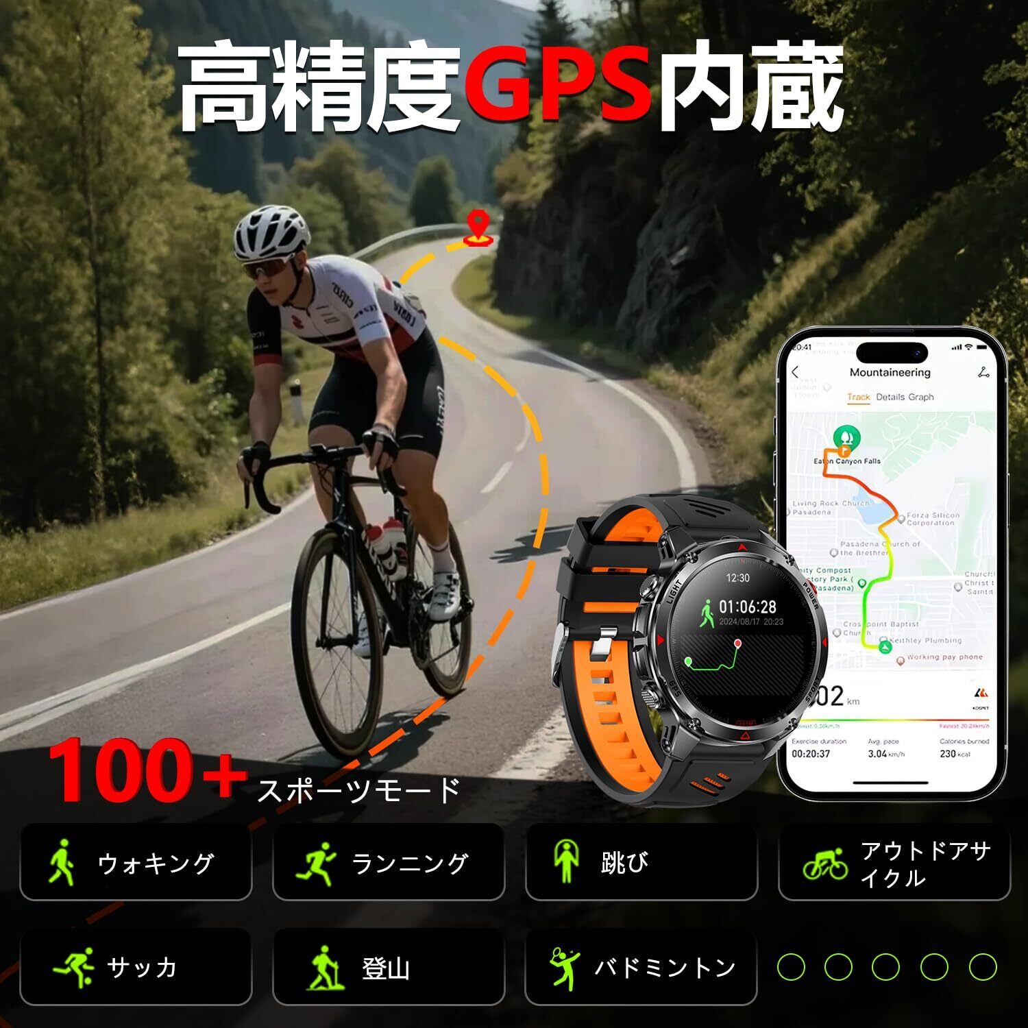 【ChatGPT搭载&内蔵GPS&懐中電灯・コンパス・高度・気圧センサー】最新のChatGPTを搭載し、専用アプリ「FitCloudPro」と連携することで、話題のAI機能を手元で気軽に利用できます。料理中にレシピのヒントを聞いたり、運動中に気になる情報を調べたり、ちょっとした疑問をその場で解消することが可能。音声入力に対応しているため、スマートフォンを操作しづらいシーンでも自然に使えるのが魅力です。内蔵GPSを搭載し、ランニングやサイクリングのルートをスマートフォンなしで正確に記録可能。都市部の日常ジョギングから郊外のロングライドまで、リアルタイムで移動データを確認でき、運動管理がより効率的になります。ウォーキングや散歩でも自分の歩行軌跡を残せるため、日常的な健康維持にも役立ちます。懐中電灯機能は、夜間のランニングや暗い帰宅道での安全確保に役立ちます。突然の停電やアウトドア活動時には周囲を照らす簡易ライトとして使用可能。さらに、SOSモードを搭載し、警報音とライトの点滅によって緊急時に周囲へ自分の状況を知らせることができます。登山やキャンプ、夜間の移動時にも強力な安心感を提供します。加えて、コンパス・高度計・気圧センサーを内蔵。登山では正確な方位確認や標高把握が可能で、気圧の急変を検知すれば天候の変化を予測することも可能です。これにより、都市生活からアウトドアアクティビティ、さらには冒険的な環境まで、あらゆるシーンで頼れるパートナーとなります。