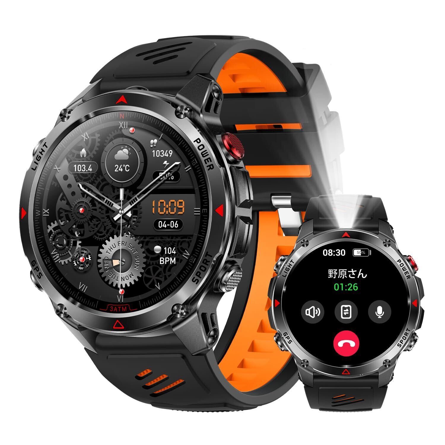 【軍用規格設計&IP68防水防塵性能&長時間バッテリー&1.46インチ大画面】軍用規格に準拠した堅牢な設計で、衝撃・高温・低温・防塵といった厳しい条件に耐えられるタフネスモデルです。登山やキャンプなどのアウトドア活動はもちろん、砂埃の舞う工事現場や気温差の激しい環境下でも安定して動作し、頼れるパートナーとなります。耐摩耗性に優れた素材と傷に強いガラスを採用し、日常生活の小さな衝撃から過酷な環境まで安心して使用できます。さらに、IP68等級の防水防塵性能を備え、雨の日のランニングや手洗い時、アウトドアでの突然のスコールにも対応。汗や水しぶきを気にせず、スポーツや旅行中も着けたまま快適に使えます。水泳などの日常的なシーンでも取り外す必要がなく、アクティブなライフスタイルに最適です。また、大容量バッテリーを搭載し、日常的な使用で約7〜10日間持続可能。待機モードではさらに長時間使用でき、長期の出張や旅行、電源の確保が難しいアウトドア活動でも充電の心配を減らします。軍用規格の堅牢性とIP68の高い防護性能、そして長時間バッテリーの組み合わせにより、日常から冒険まで、あらゆる場面で安心して使用できるスマートウォッチです。1.46インチのIPSフルタッチスクリーンは360×360の高解像度を誇り、鮮やかな色彩とクリアな表示を実現。運動中でも視認性が高く、メール・LINE通知・通話情報を一目で確認できます。さらに抬腕点灯機能により、手首を上げるだけで画面が瞬時に点灯し、時間やメッセージを即座に把握。屋外ランニングやジムトレーニング中でも操作の煩わしさを軽減します。