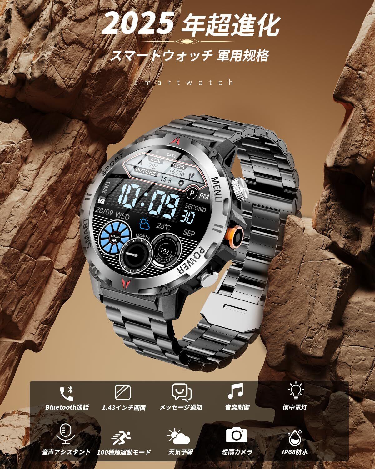 スマートウォッチ【2025改良最新型 2種バンド付き】軍用規格 懐中電灯付き Bluetooth5.3通話 LINE/メッセージ通知 100+運動モード GPS運動記録 スポーツウォッチ 長持ちバッテリー 腕時計 歩数計 遠隔撮影 腕上げ点灯 スポーツウォッチ 音楽制御 音声アシスタント 目覚まし時計 天気予報 iPhone/アンドロイド対応 smart watch(ブラック)