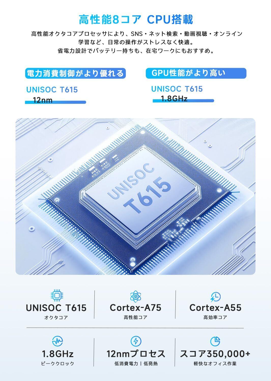 【6000mAh大容量バッテリー&PD18W急速充電】このAndroidタブレットは6000mAhの大容量バッテリーを搭載し、日常使いからアウトドアまであらゆるシーンで頼れる長時間駆動を実現。NetflixやYouTubeなどの動画を約9~12時間、SNSやニュースサイトの閲覧を約10~12時間、音楽再生なら最大70時間以上と、一日中使い続けても安心のスタミナ。ゲームプレイ時でも約9時間の連続使用が可能で、外出先での急なバッテリー切れの心配がありません。PD18W急速充電(※充電器は別売り)に対応しているため、短時間の充電で長時間使用可能、通勤や通学時はもちろん、旅行・出張用としても活躍します。
