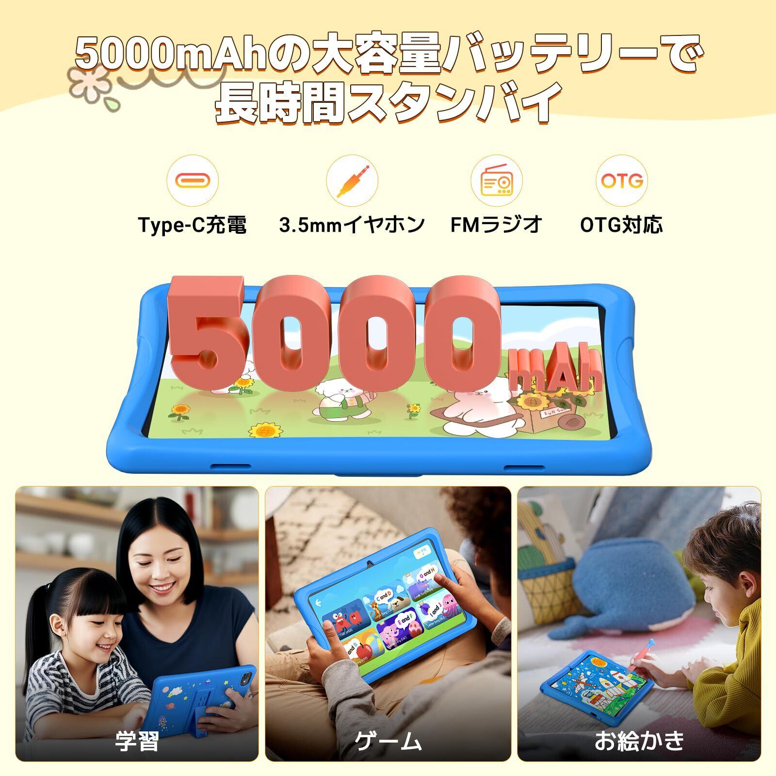 【12GB RAM+64GB ROM+2TB TF拡張&5000mAh大容量バッテリー】この10インチの子ども向けタブレットは、12GB(4GB+8GB仮想RAM)と64GBのストレージを搭載し、microSDカード(別売)で最大2TBまで拡張可能です。たくさんのアプリやコンテンツを快適に保存できます。安定したWi-Fi接続でスムーズなインターネット環境を提供。5000mAhの大容量バッテリーで、長時間の映画視聴やゲーム、学習をサポートし、お子さまの成長をしっかりと支えます。