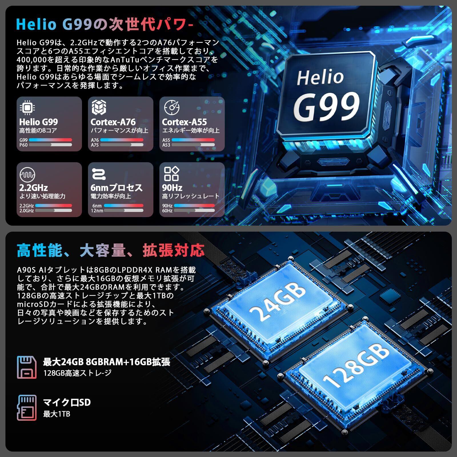 【大容量メモリ24GB /128GBストレージ & 最大1TB拡張対応】AvidPad a90s Helio G99タブレットは実装メモリ8GBに加え、最大16GBまで拡張可能な仮想メモリ機能を搭載。アプリの同時起動や切り替えもスムーズで、動画視聴・ネット通販・電子書籍・オンライン授業・ゲームプレイまで、快適なマルチタスク環境を実現します。さらに、このG99タブレットは128GBの大容量ストレージを内蔵、写真・動画・音楽・アプリをたっぷり保存可能。最大1TBまでのmicroSDカード拡張にも対応し、容量不足の心配がありません。490g軽量・8mm薄型設計で持ち運びやすく、テレワーク・旅行・カフェでの作業・ビジネス用・学習用タブレットとしても最適です.家族での共有、お子様の学習用端末、外出先でのエンタメ視聴にもおすすめ。高性能CPU Helio G99 搭載タブレット / Android 15 / 高解像度大画面 / ロングバッテリー / 高速Wi-Fi対応で、コストパフォーマンスに優れたアンドロイドタブレット一台です。