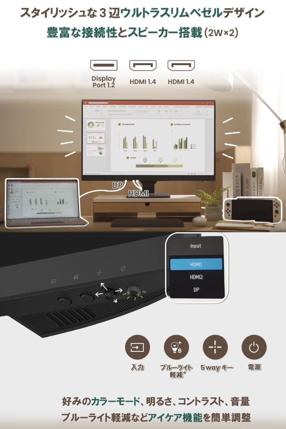 HDMIとDisplayPort接続端子を備え、スピーカー(2Wx2)も内蔵しているため、モニター単体でサウンドを再生できます。用途に合わせた8種の画面モード(標準、コーディング、ケアモード、M-book、動画、ゲーム、ePaper、ユーザー)で最適な色味に設定可能です。