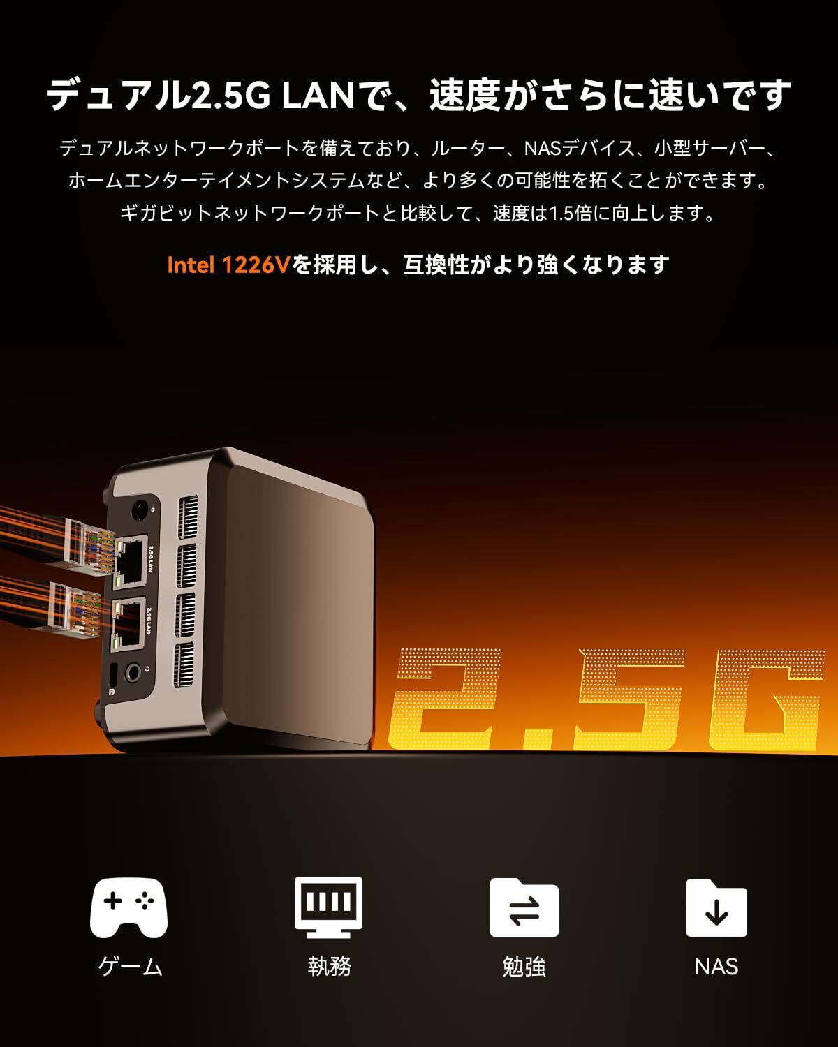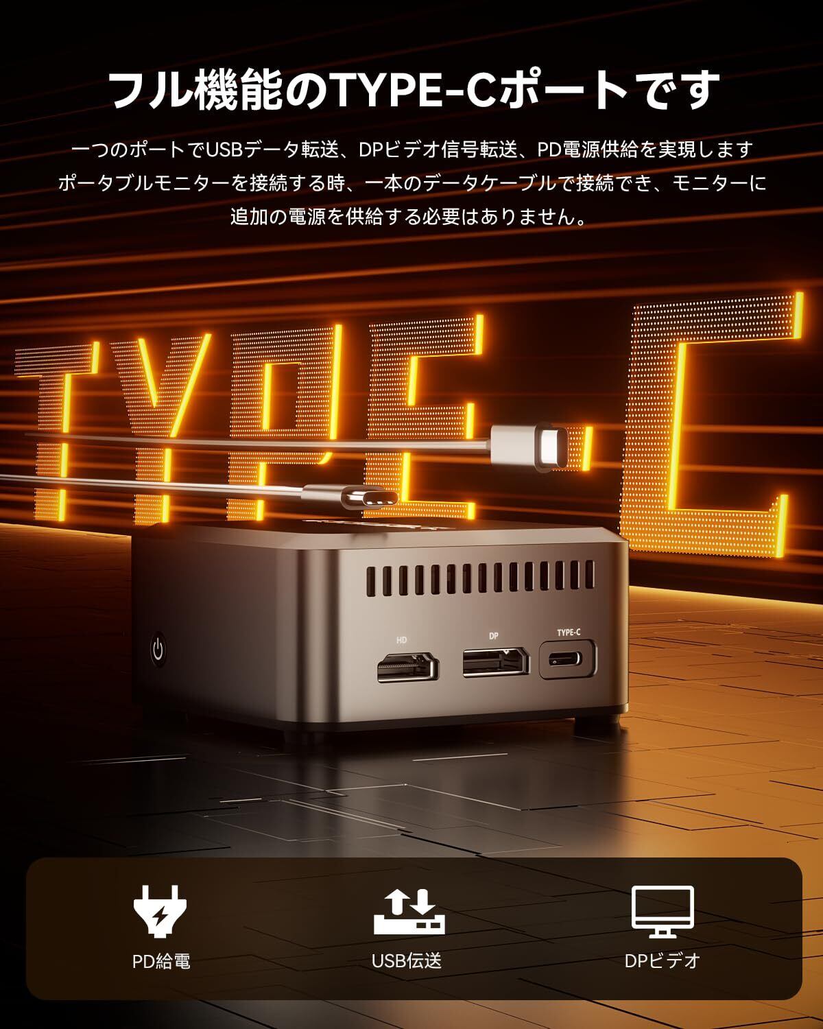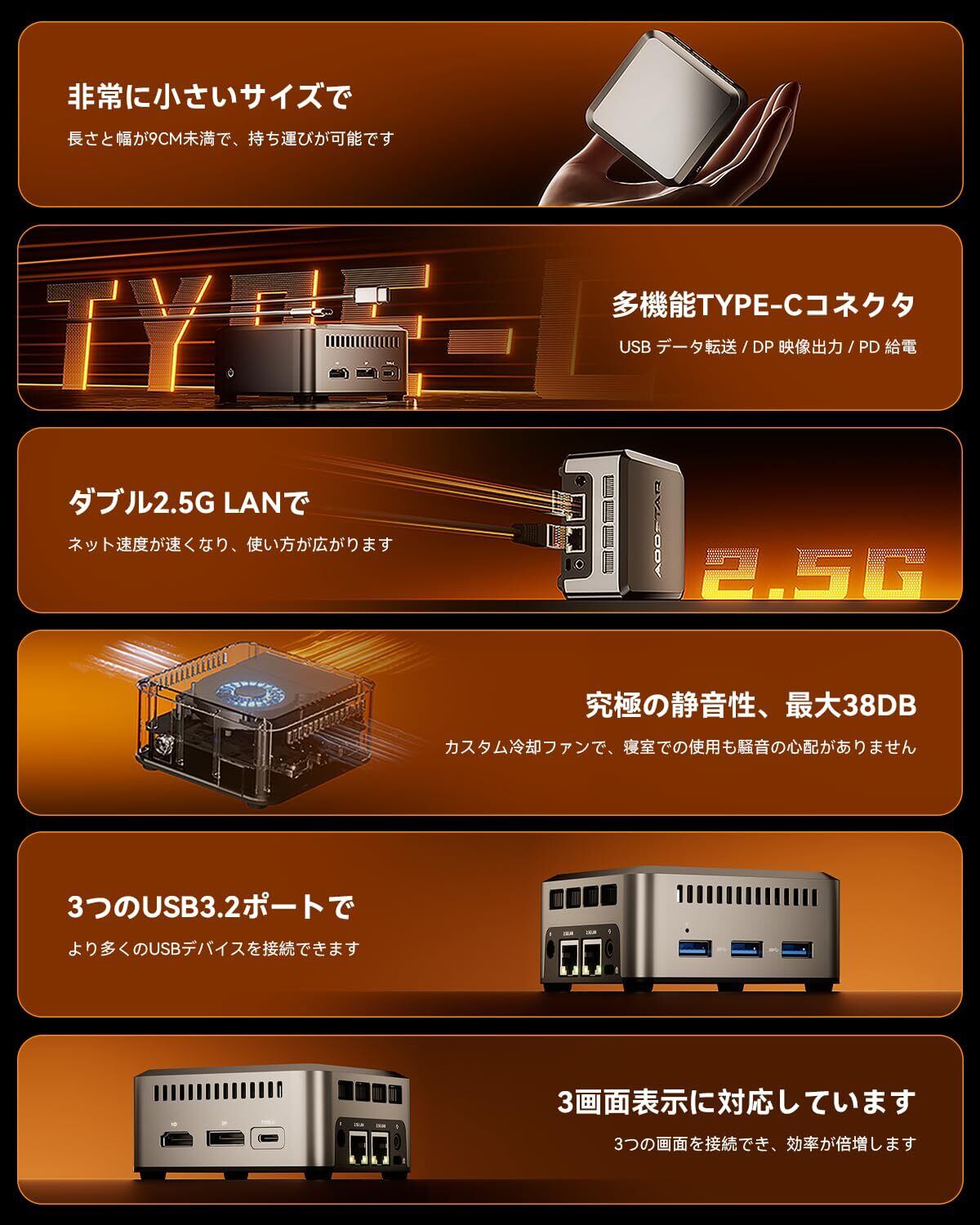 【超小型多機能PC】サイズはわずか8.9*8.9*4.15CM、重量はわずか0.2KGであるが、HDMI、DPと4K 60Hzのトリプルディスプレイ出力に対応できるフル機能のTpye-Cインターフェイスを搭載し、2.5G LANインターフェイスを2つ備えているため、DIYの可能性を高めることができる。