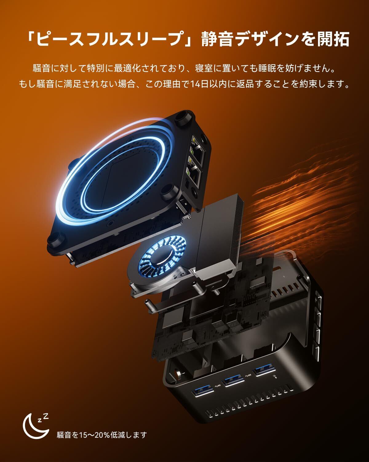 【超静音の小型pc】新型ミニ本体は放熱ファンとして高密度のタービン翼を採用しており、消費電力を最高15Wにしても、50CM離れたところではほとんど音が聞こえない。