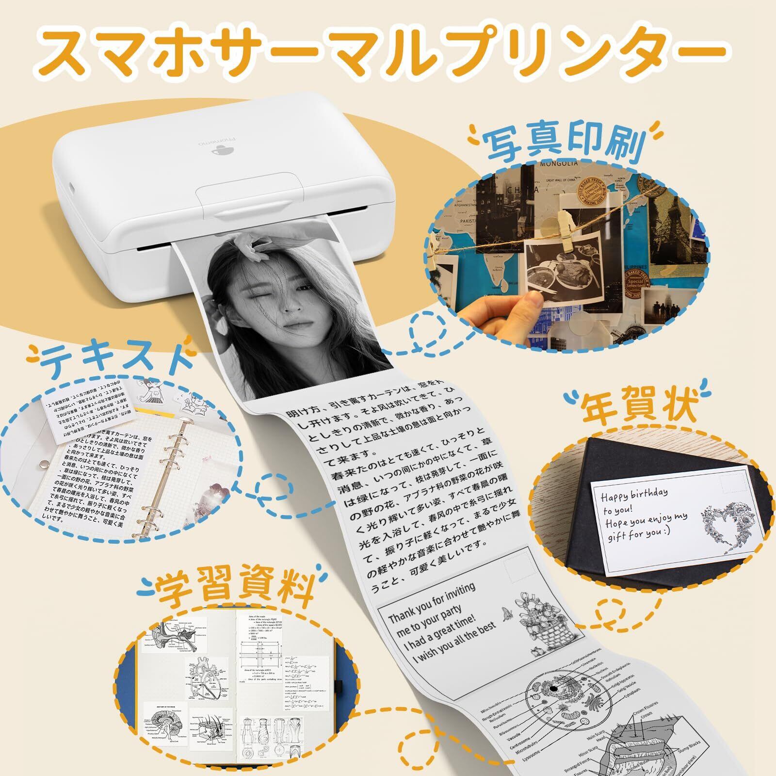用途が広い-大サイズのサーマルプリンタは、サラリーマンがドキュメントを印刷するのに最適で、学生や先生がノートを印刷したり、練習したりするのにも適しています。それだけでなく、他のアイデアシールや手作りの書籍を印刷するのにも使用できます。これは多機能ポケットプリンタです。