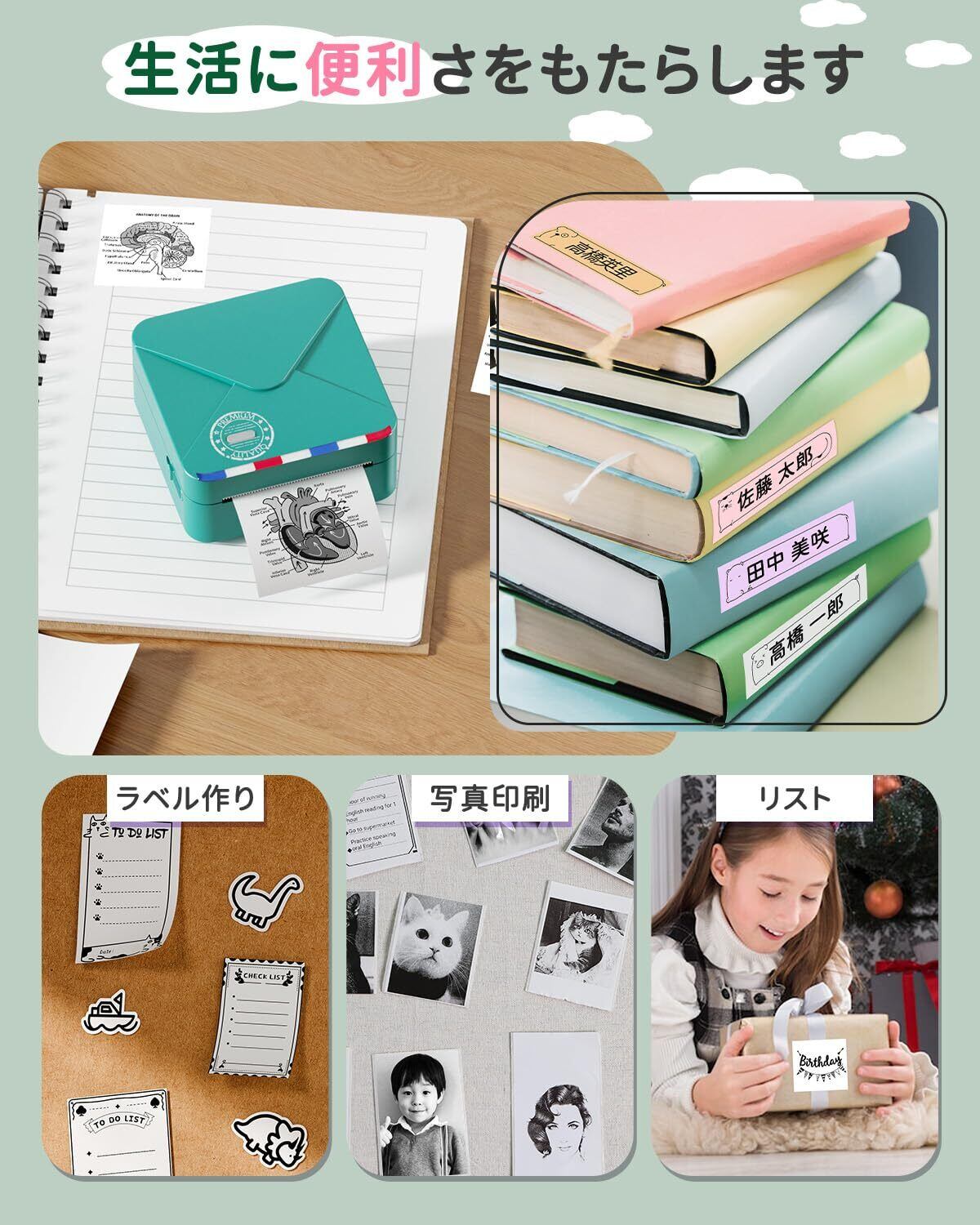 [多サイズ対応]M02S スマホプリンターは15mm・25mm・53mm の感熱紙とテープに対応し、用途を幅広くカバーします。学習ノート、フラッシュカード、図形図の印刷はもちろん、整理収納用ラベル、手帳装飾、年賀状、はがき、家計簿、オフィス文書など、日常のさまざまな場面で活用できます。約 40 カラーの感熱ロール紙から選べ、オリジナルステッカーを作れます