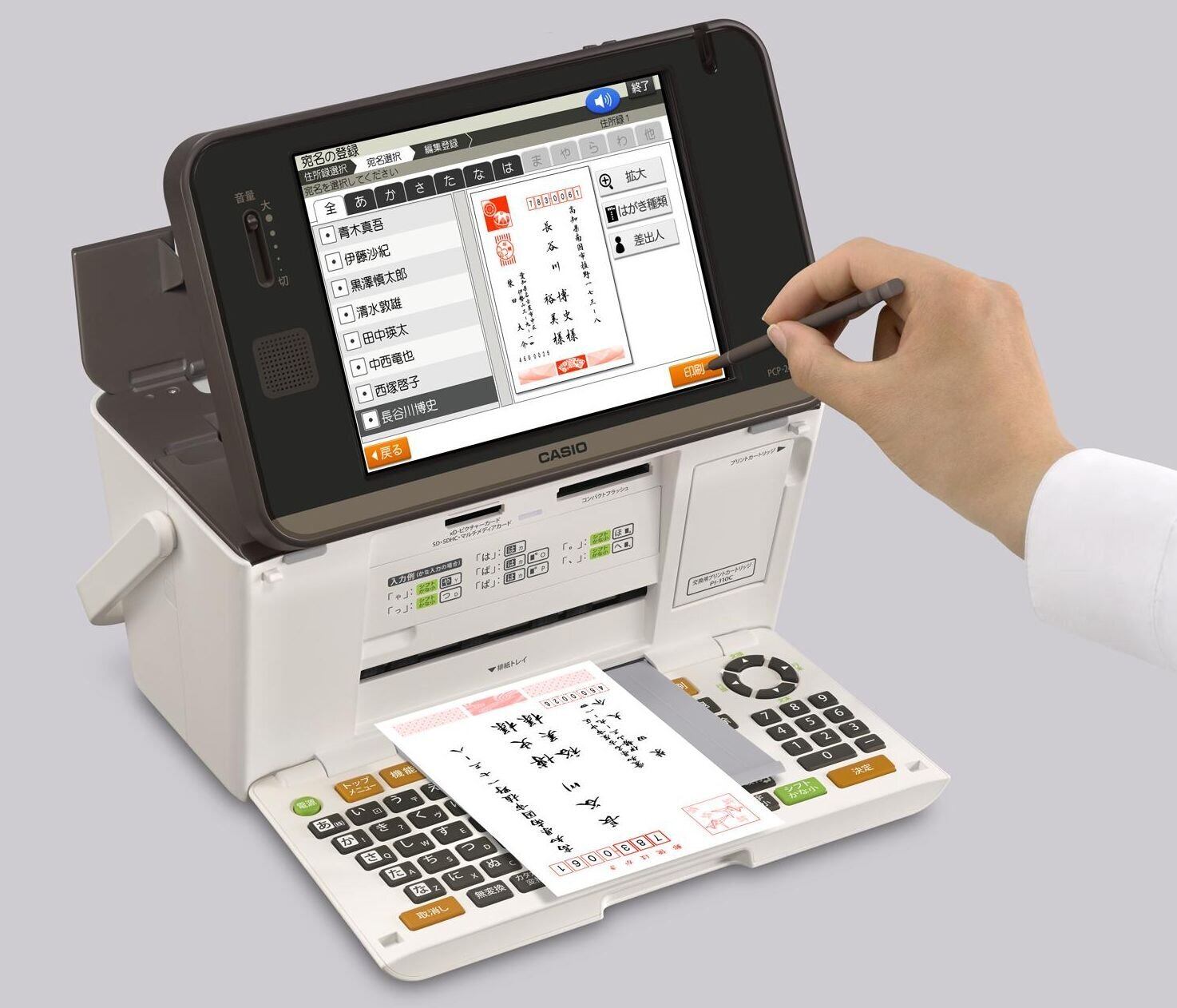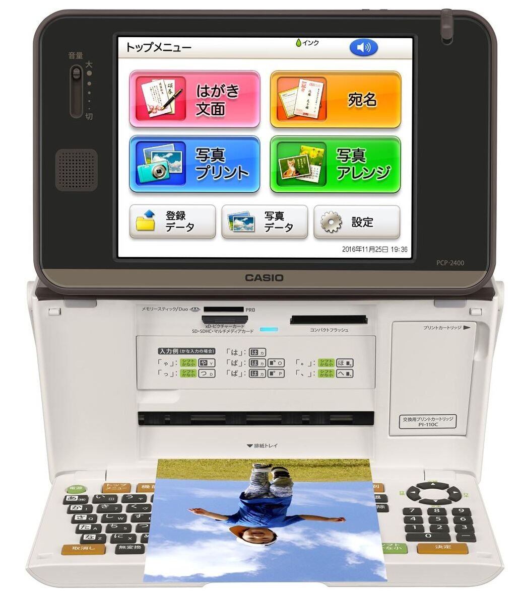 このカシオのハガキ&年賀状&フォトプリンターは、便利な手書き認識とタッチ操作を備えています。写真アレンジ機能も豊富で、日本語入力はATOKシステムを搭載しています。このプリンターは、A6サイズの紙にカラーで高解像度(2400x1200ドット)で印刷することができます。また、メモリーカード印刷と液晶モニターも搭載しています。この全てが一つのプリンターに収まっており、写真印刷や特殊用紙印刷(ハガキ・年賀状など)に最適です。