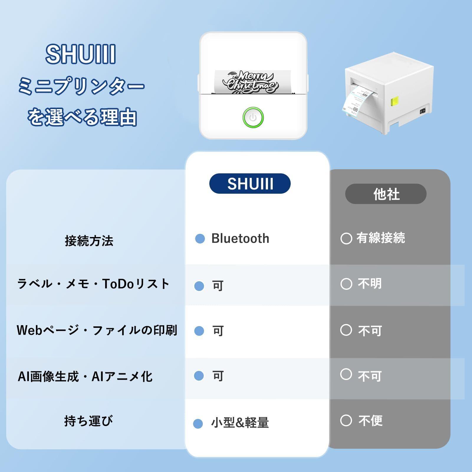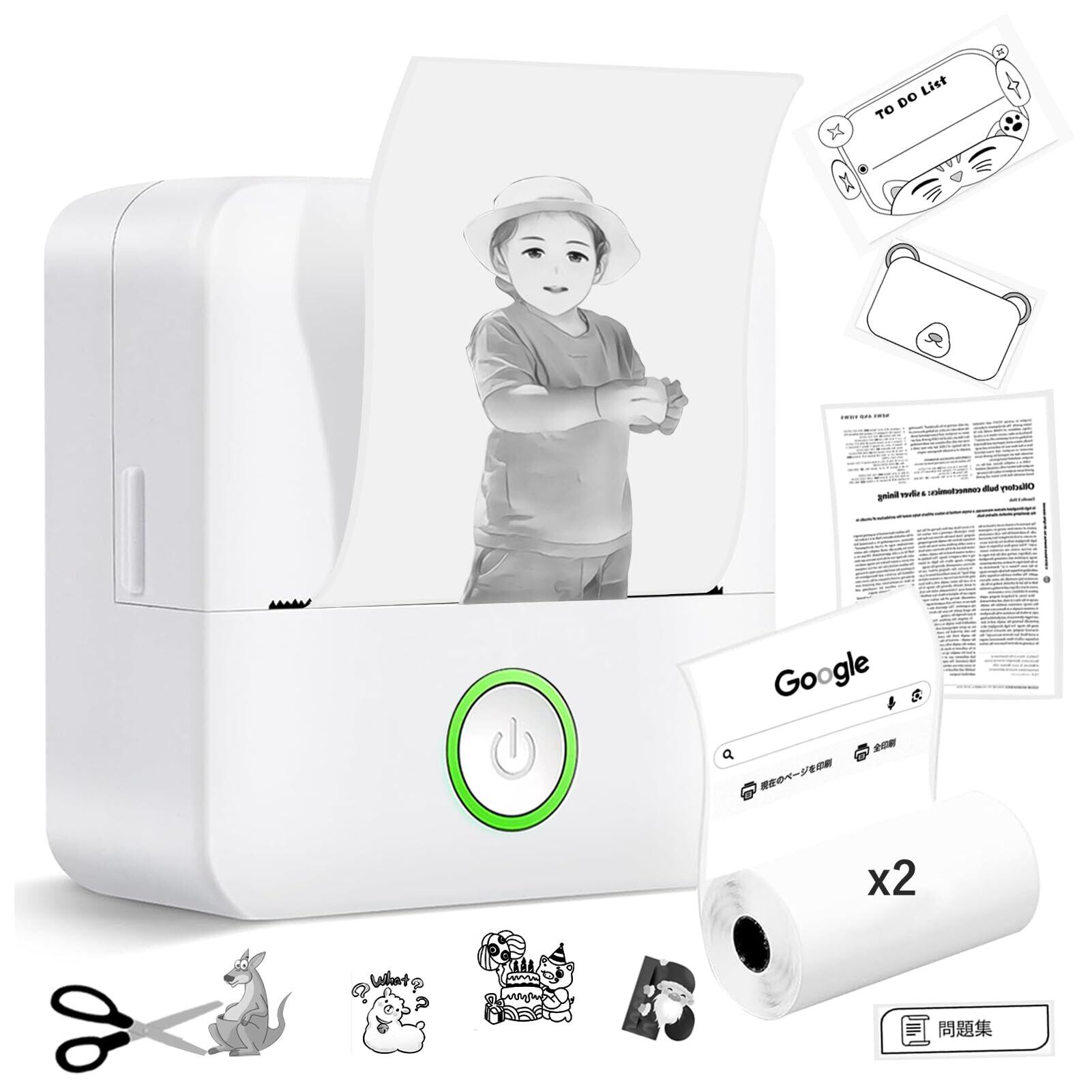 スマホプリンター ミニプリンター スマホ対応 【AIアニメ化&画像生成AI】 サーマルプリンター Bluetooth接続 USB充電式 1200mAh モバイル Android iOS対応 ポータブル 小型 モノクロ ラベル 勉強/ノート/写真/リスト/メモ/手帳/領収書/ラベル/テレワーク/業務用/家庭用 感熱紙 2ロール カッター付き