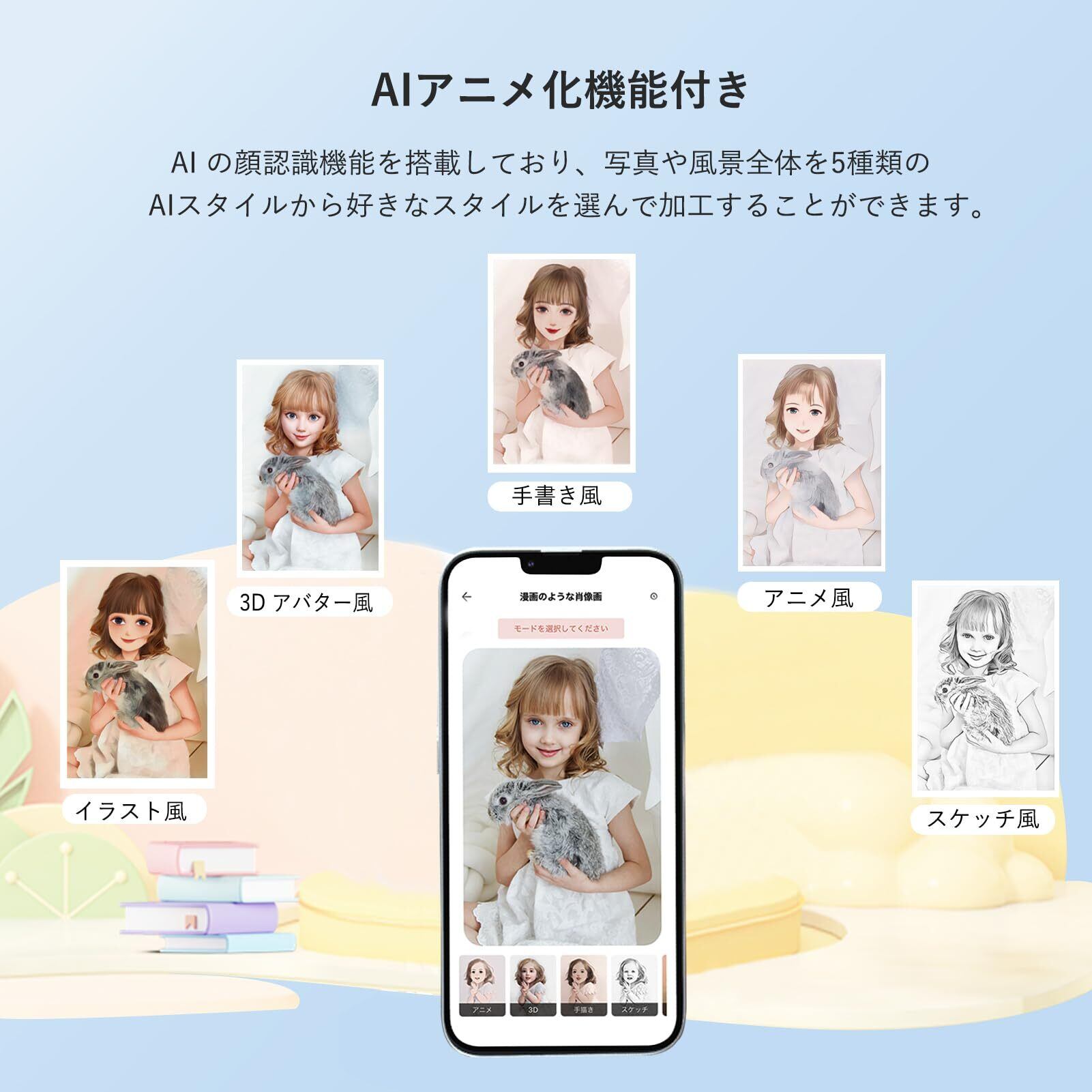 【AIアニメ化機能付き&シール化】 スマホで連携できるBluetooth接続のほか、無料の専用アプリを使えば写真の編集や加工も可能なラベルプリンターです。AI の顔認識機能を搭載しており、写真・風景全体を漫画・アニメ風に加工することができます。アニメ風、イラスト風、3D アバター風、手書き風、スケッチ風と5種類の AI スタイルの中からお好みのスタイルを選ぶだけで、かわいいアニメキャラに変身することができます。印刷紙がシール紙になっており、写真を手帳や冷蔵庫、壁などに貼り付けられます。