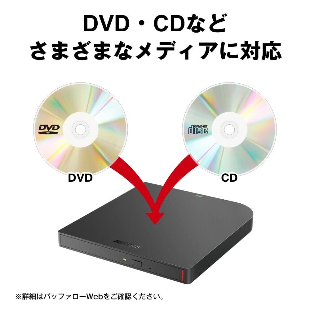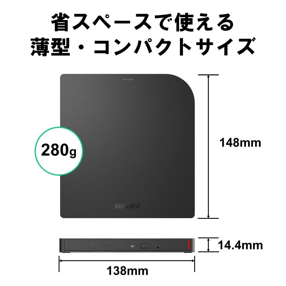 バッファロー USB3.2(Gen1)/3.0 外付け DVD/CDドライブ 書込みソフト バスパワー(給電ケーブル付き) 薄型ポータブル 国内メーカー Windows/Mac ブラック DVSM-PUV8U3-BK/N