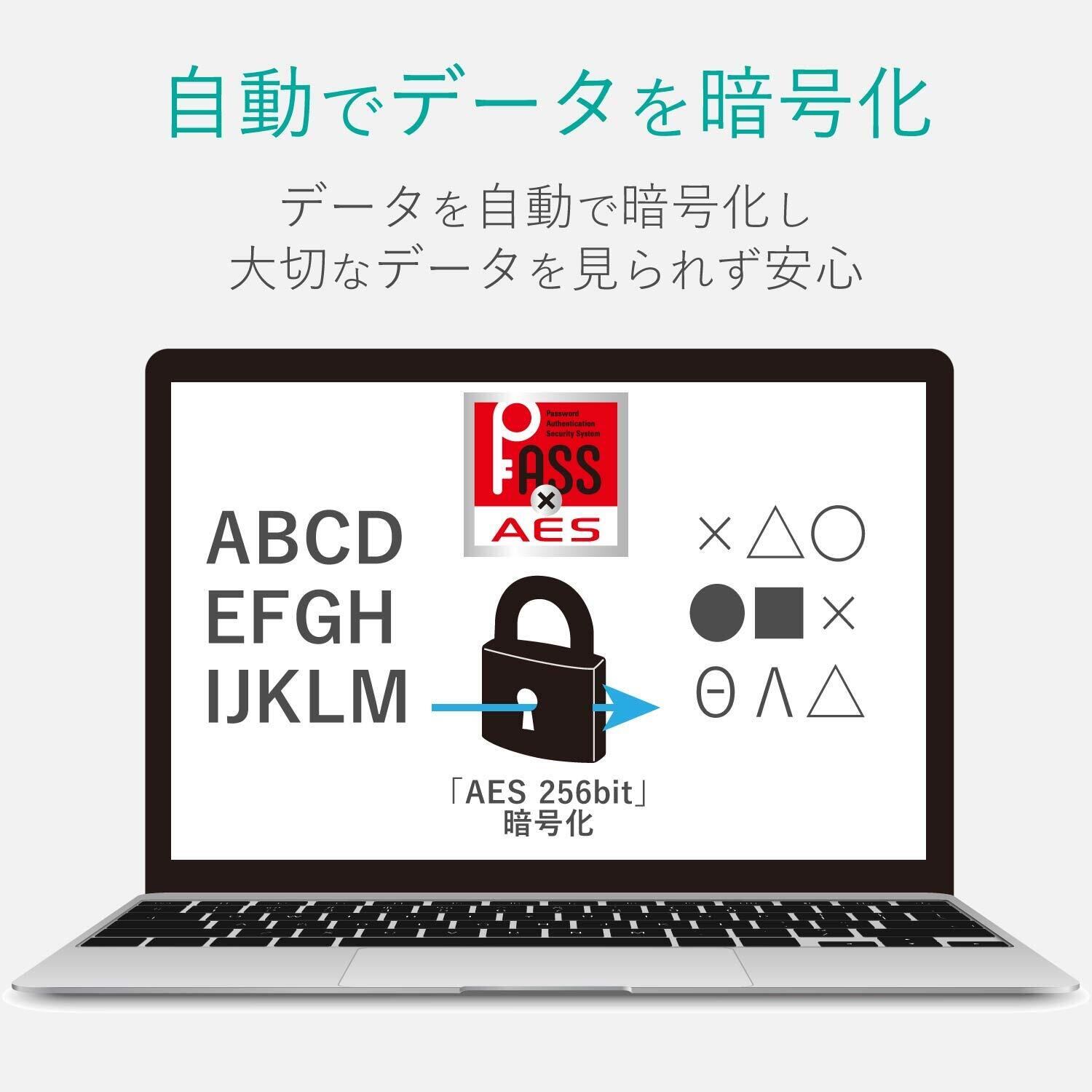 ■「PASS(Password Authentication Security System)×AES」使用時は、保存されたデータは、信頼性の高い強固な暗号化方式「AES256bit」で暗号化されるので、万一の紛失や盗難でも大切なデータの情報流出を防止します。