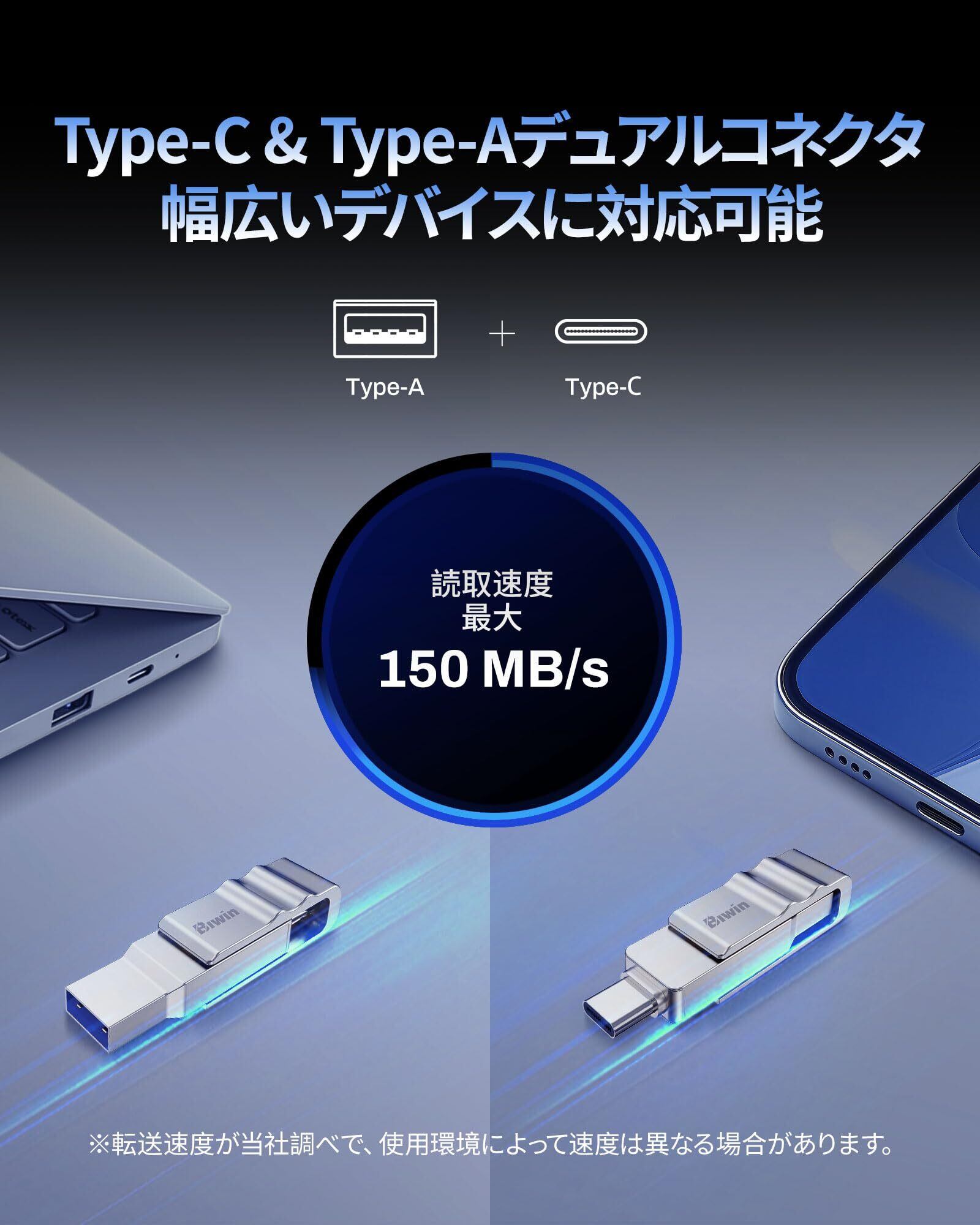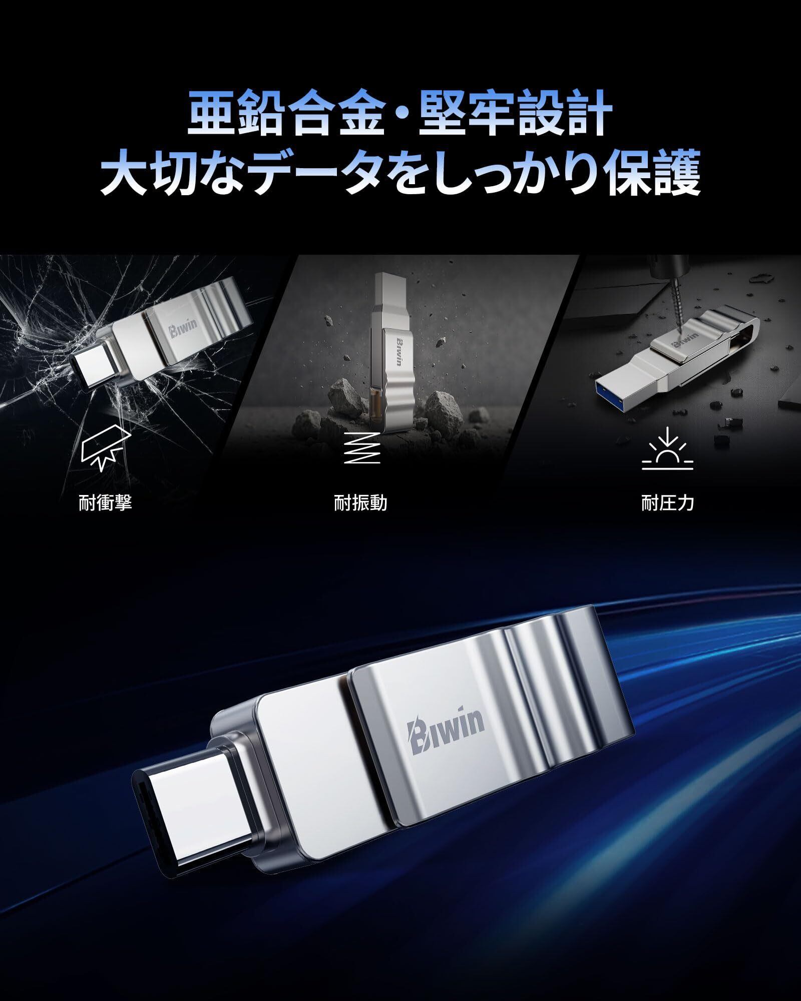 Biwin UD150 USB メモリ Type-C/A 2in1 回転式 64GB USB 3.2 高速 最大読出速度150MB/s 金属製 軽量&耐久性 USB-C/Aデュアルコネクタ