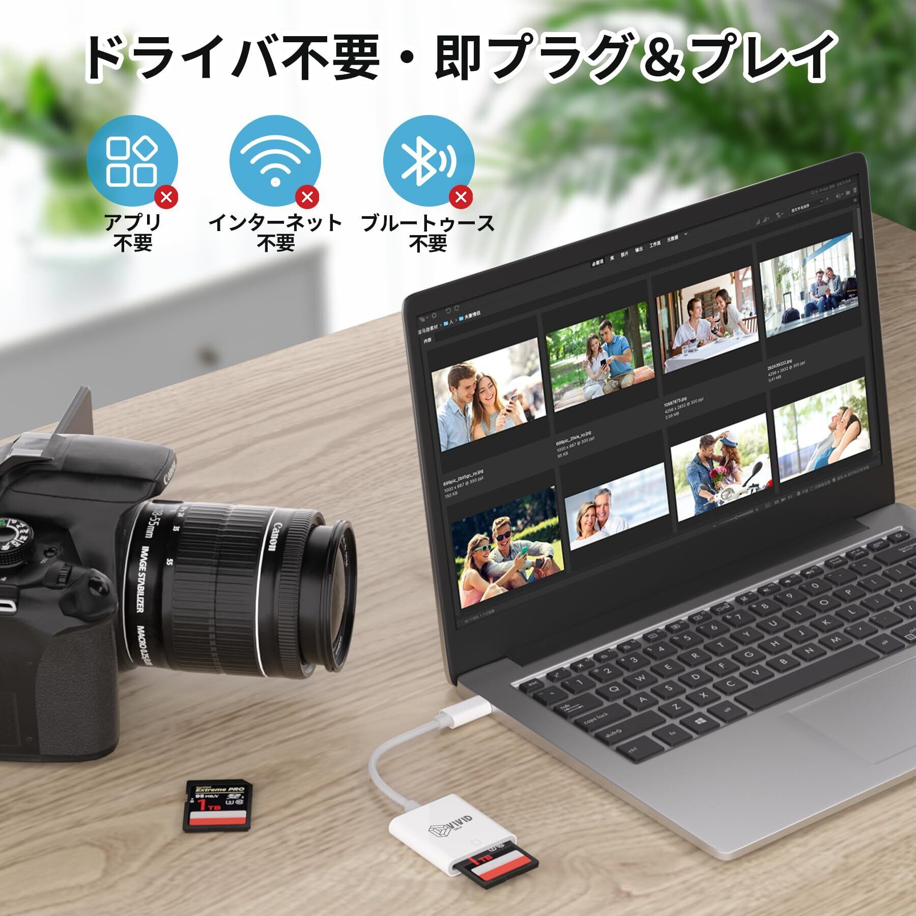 【sdカードリーダー】sdカードリーダーは、iPad PRO、iPad mini、iPad Air、iPhone 15シリーズ、Samsung、Google、HUAWEI、SONY、XIAOMI、MOTO、まだはLaptop book(Windows, Android, Mac OS)など、さまざまなUSB-C端子を備えたデバイスに対応(OTG機能を使用する必要があります)。sdカードリーダー タイプcを使えば、カメラの画像や動画をいつでもどこでも簡単にソーシャルメディアにシェアできます。sdカードリーダー タイプcは、特に動画ブロガーやフォトグラファーに最適な高性能リーダーです。(ご注意:Lightning端子には対応していません)