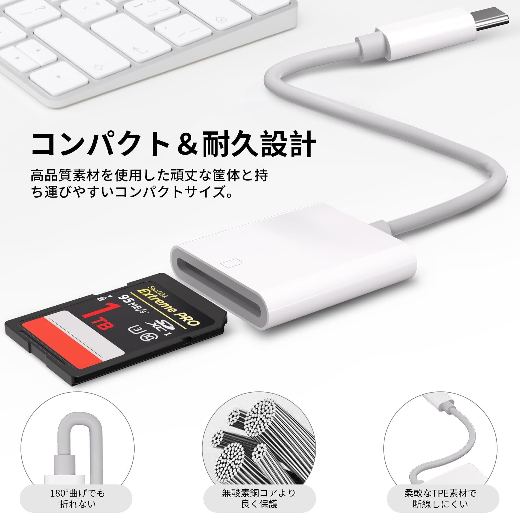 【1TB 大容量&耐久設計】タイプc sdカードリーダーは、SDXC、SDHC、MMCをはじめ、あらゆる種類のストレージカードに対応します。カードリーダー タイプcは、安定した伝送を実現する高品質な無酸素銅線コアと、断裂を防止するTPE強化素材を使用(2000回の曲げテストに合格済み)。sdカードリーダーは、音楽、動画、写真、文書などさまざまなファイルタイプを簡単にインポート・エクスポートできます。