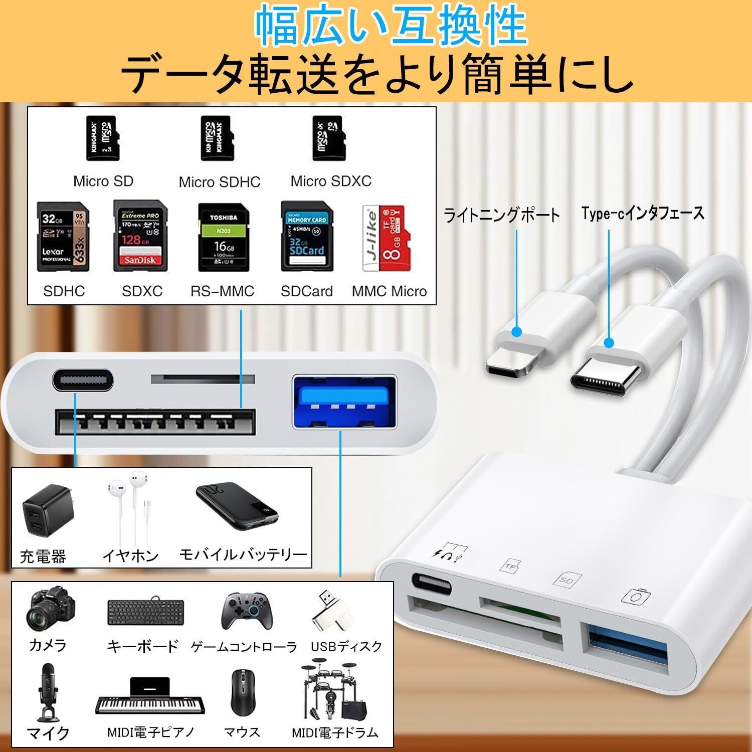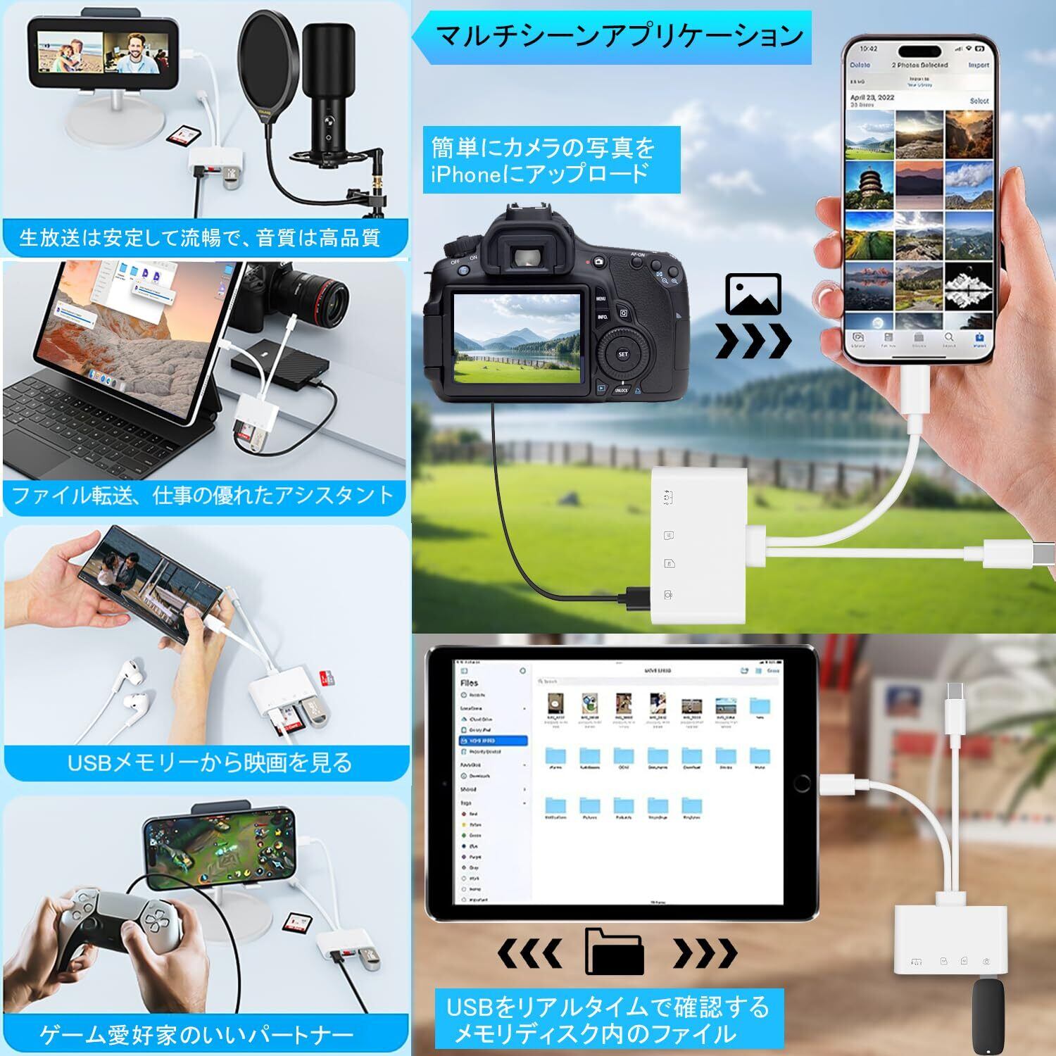 【幅広い互換性】このライトニング sdカードリーダーには、USBCとのデュアル出力ポートが装備されており、通常のカードリーダーよりも互換性が向上している。Phone 17/16/15/14/14 pro/14 Pro Max/13/13 Mini/13 Pro/13 Pro Max/12/12 Mini/12 Pro/12 Pro Max/11/11 Pro/11 Pro Max/Xs/Xs Max/Pad Pro/Air/Mini/などに対応。USB-Cポートを備えたi-phone 15、i-Pad Pro、Macbook、iMac、Google Pixel、 Dell XPSなどのPCと互換性があり、OTG機能付きの Androidスマホ、タブレットにも対応しています。タブレットからusbアダプタまで標準の写真フォーマットやJPER、RAW、SD、hdビデオフォーマットに対応しています。カメラ、キーボード、USBメモリ、カードリーダーなど、USB周辺機器を接続することもできます。