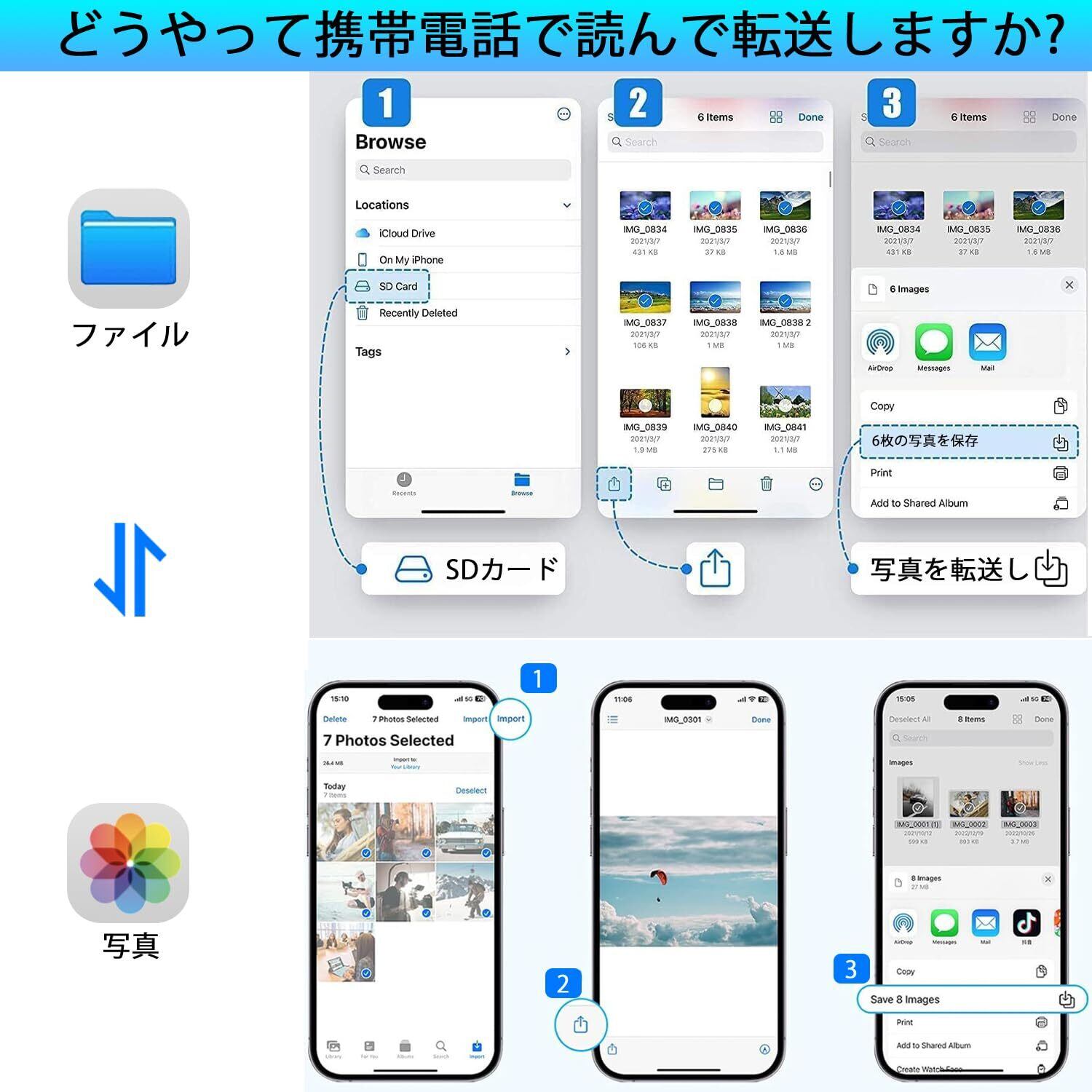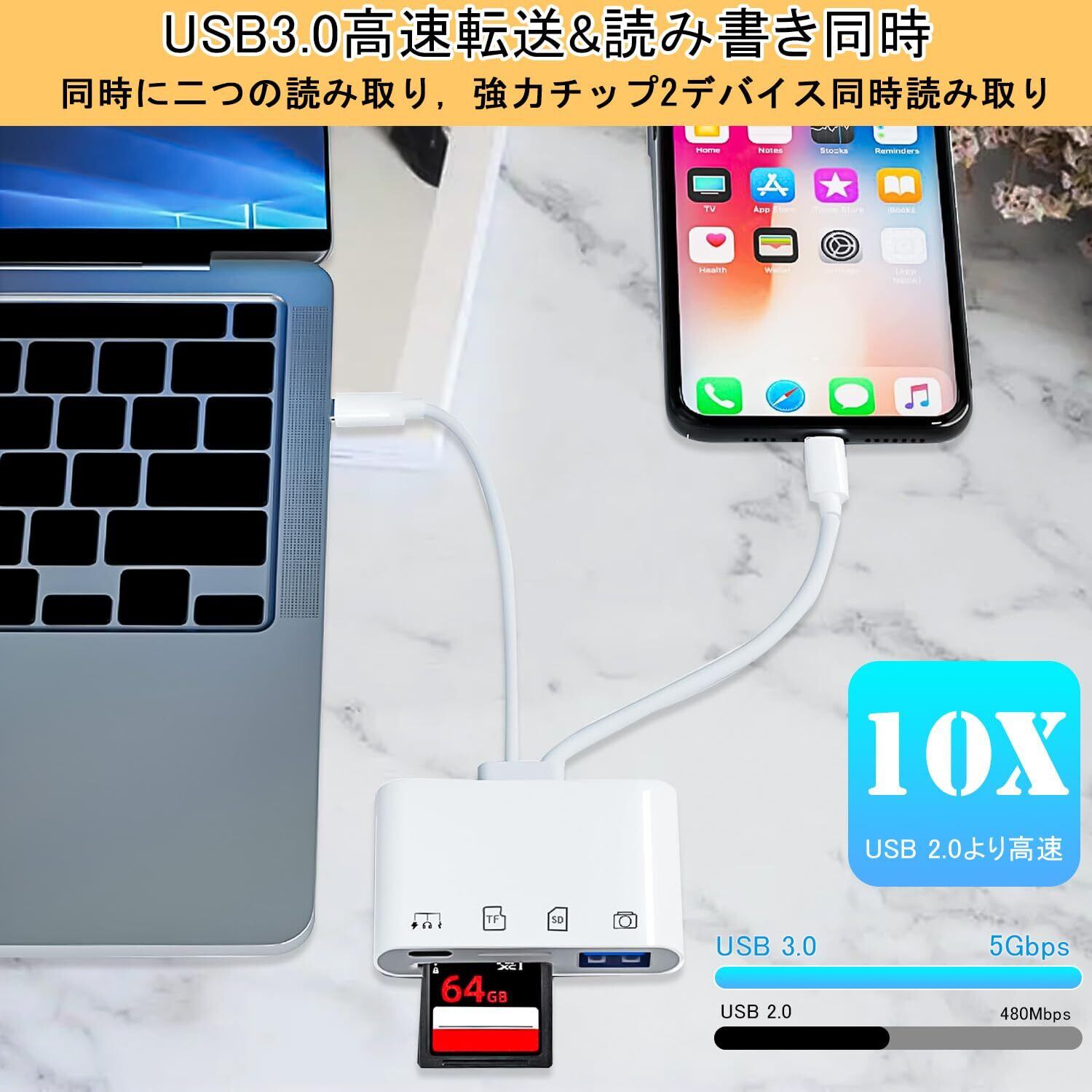 【高速データ転送・双方向】 新世代チップを採用されたデータケーブルリーダーで、MFI認証チップとUSB3.0高速転送プロトコルを搭載し、同時に接続された機器をより安全で安定した状態にします。フォトアルバム、ビデオ、映画などを瞬時に転送できます。100枚の写真をわずか数秒で転送できます。双方向:スマホからSD/TFカード/USBメモリへ、SD/TFカード/USBメモリからスマホへ、両方ともサーポートできます。データ転送は速くて簡単!