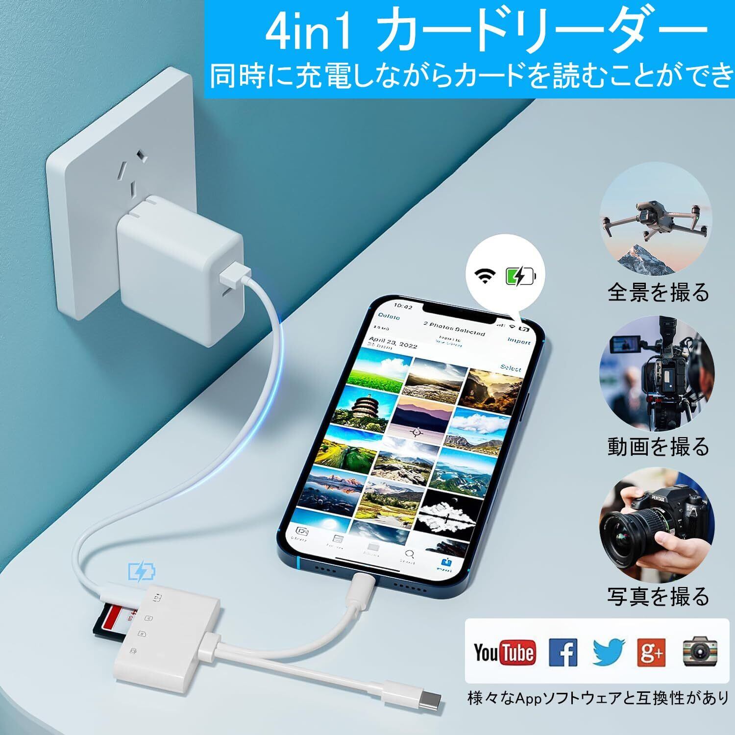 【操作簡単】専用アプリやインターネット不要でデータ通信制限を気にすることなく、カードリーダーを接続するだけで、簡単にデジタルカメラで撮影した写真を携帯電話、パソコンに転送できます。小さいなサイズで軽く、ケーブルも短く、携帯しやすい。小型&軽量なデザインで持ち運びにも便利です。OTG機能対応で、パソコンがなくても、データーの即転送が可能です!旅行中、いつでもお気に入りの写真やビデオを家族や友人と、またはソーシャル アプリで共有できます。ご出張中、ご旅行中、手軽にカバンに入れて楽々です、写真愛好家に最適です。