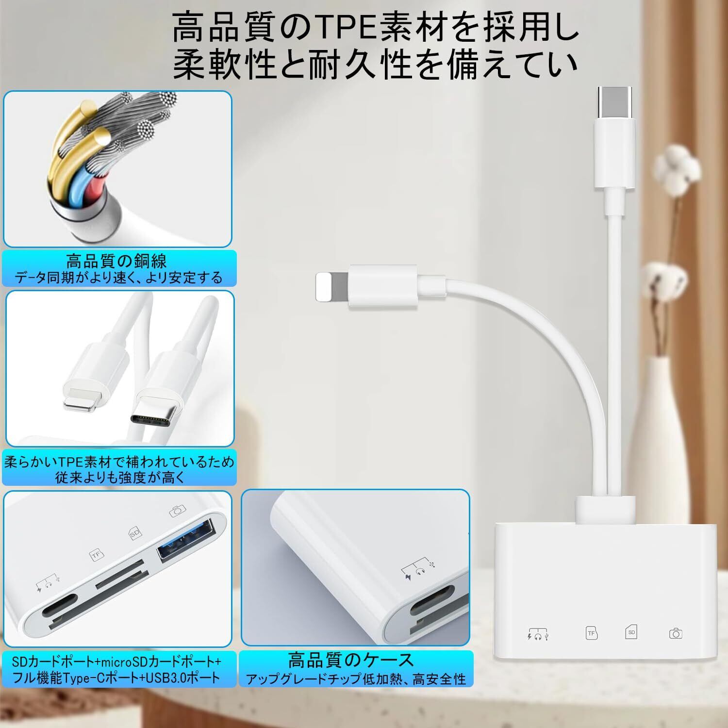 カードリーダー【2025新モデル】 SDカードリーダー i-Phone/Type Cメモリカードリーダー 4in1 USB/SD/TF変換アダプタ 0TG機能 高速双方向データ転送 設定不要 写真/動画/資料読み込み phone/i-pad/IOS/Windows/Androidスマホなどのデバイスに対応