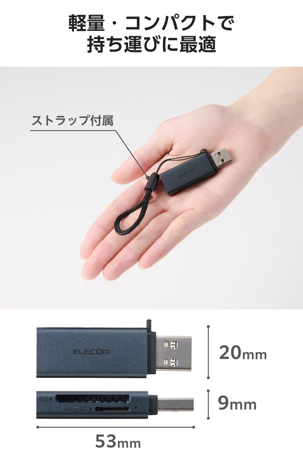 ケーブルレスでパソコンに直挿しできる、USB-Aプラグのメモリーカードリーダーです。