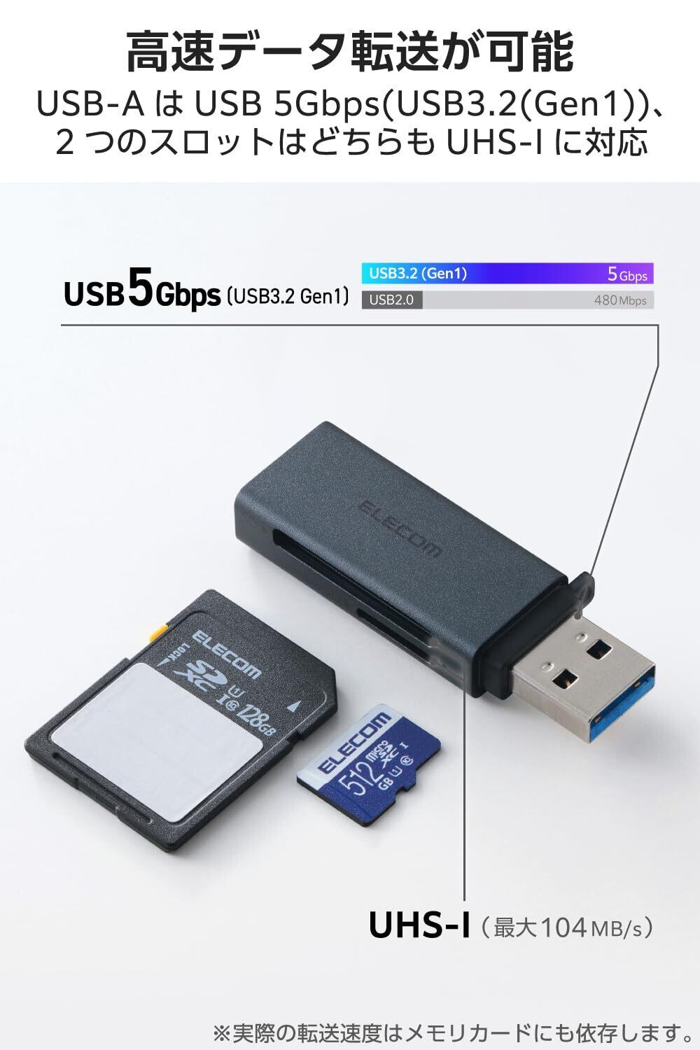パソコンとの接続はUSB 5Gbps(USB3.2(Gen1))、2つのスロットはどちらもUHS-I(最大104MB/s)に対応しているので高速データ転送が可能です。