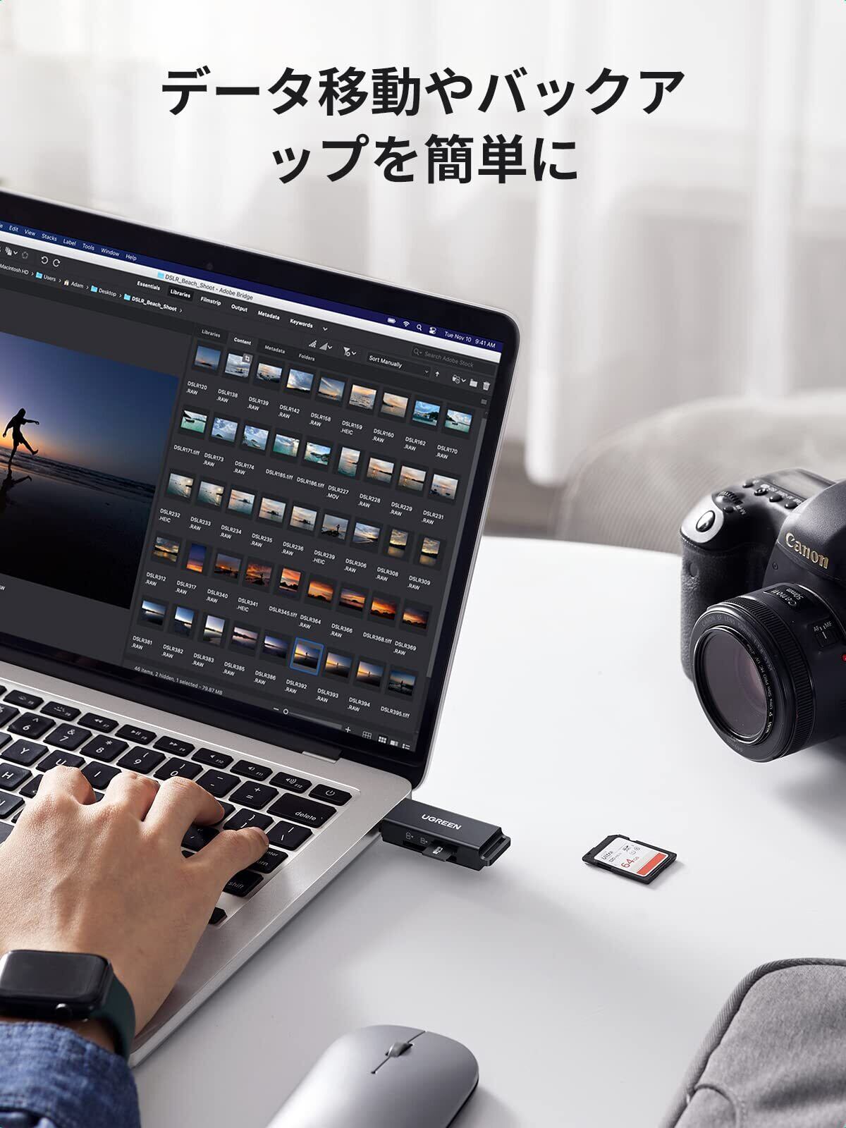 USB3.0 高速データ転送に対応。USB3ポート経由での読み書きの速度が最大5Gbpsのスピードで動画や静止画などをパソコンに取り込むことができます。反応速度が早く、ストレスがなく使用できます。