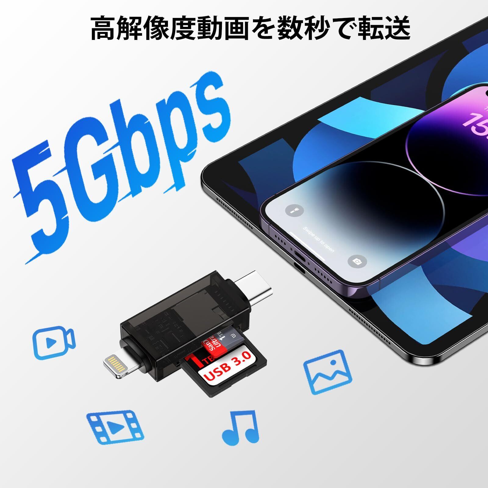 【デュアルインターフェース設計|Lightning + Type-C】Ocbuo マルチカードリーダーは、Lightning と Type-C の2つのインターフェースを一体化。Lightning または USB-C 対応デバイスとの幅広い互換性を実現し、最大 5Gbps の高速転送をサポートします。1GBの大容量ファイルでも数秒での転送が可能。SDカードやTFカード(microSDカード)の効率的な管理を強力にサポートします。