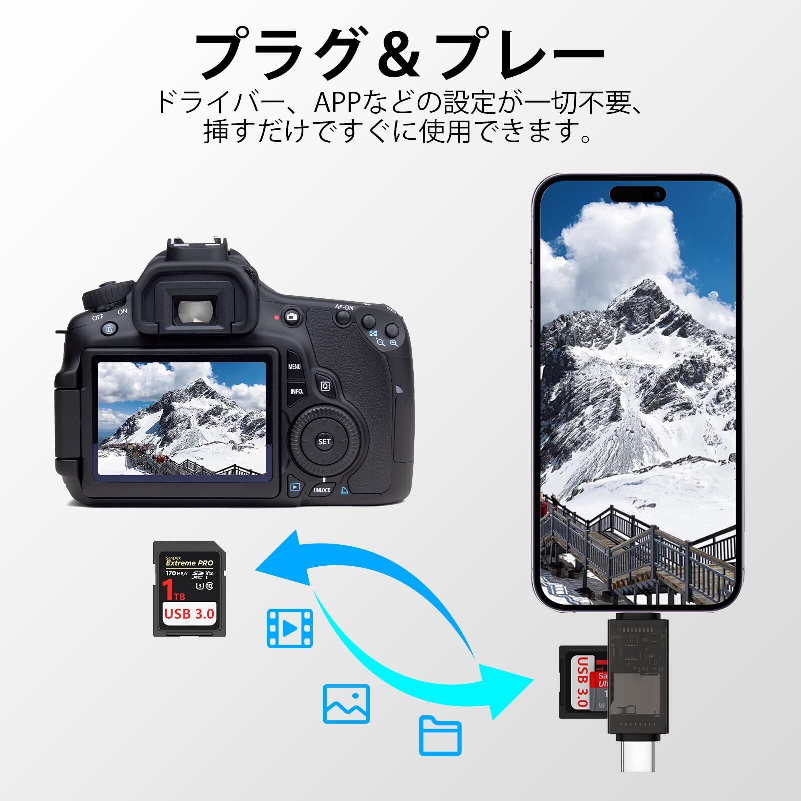 【プラグ&プレイ|ドライバ不要】ドライバや専用アプリのインストールは一切不要!スマートフォンに接続するだけで即時使用が可能です。写真や動画などのファイルをリアルタイムで転送。煩わしい設定を省き、コンテンツの管理や共有を驚くほど簡単にします。耐久性に優れたプラスチック筐体は放熱性にも優れています。コンパクトなデザインとプロテクティブカバーがほこりや湿気から守り、携帯性と収納性を高めました。Type-C + Lightning デュアルインターフェースで、さまざまな環境での使用に適しています。