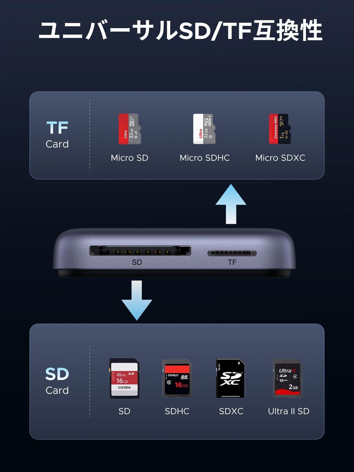 【幅広い機器互換!1 台で全て対応、両スロット同時読み取り】「カメラ用 SD カードとアクションカメラ用 TF カードのために 2 台のリーダーを持ち歩く」手間を省けます!本本sdカードリーダーはUHS-II SDスロット(SDHC/SDXC 対応)と UHS-II TFスロット(Micro SDHC/Micro SDXC 対応)を搭載し、最高2TB容量のメモリーカードを安定して読み取れるだけでなく、2枚のカードを挿入した状態で同時にデータを読み取ることも可能です。対応機器も非常に豊富:iPhone17/ 16/15 シリーズ、MacBook Air/Pro、iPad Pro 2018、Windows ノートパソコン、Steam Deck、ROG Ally など、USB-C インターフェースを搭載した機器ではドライバーのインストール不要で即插即用です。機器の互換性を確認したい場合は、事前にお問い合わせください。