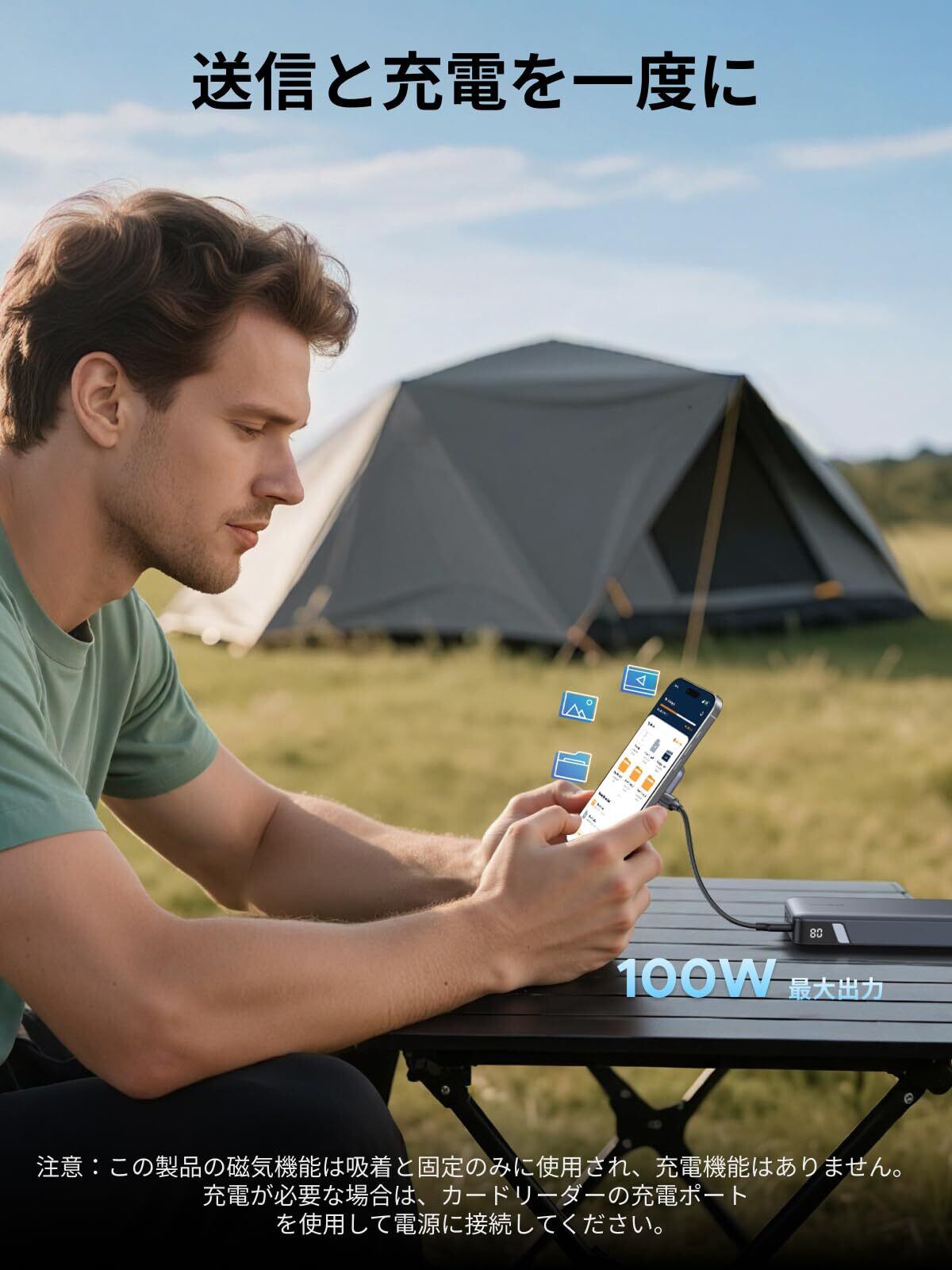 【100W PD 充電+データ転送 同時対応!多機器の「バッテリー切れ不安」を解消】外出時に「カードリーダーでデータ転送中に iPhoneやMacBookのバッテリーが減ってしまう」状況は非常に不便です。本製品はUSB-C PD インターフェースを装備し、データ転送と同時に最高100Wの給電が可能!MacBook Pro(定格 87W)や iPhone 16(27W 急速充電対応)を充電しながら、カメラの撮影データを転送できるため、「充電と転送のどちらを選ぶか」と悩む必要がなくなります(付属の0.15m CCケーブルで即座に接続可能)。