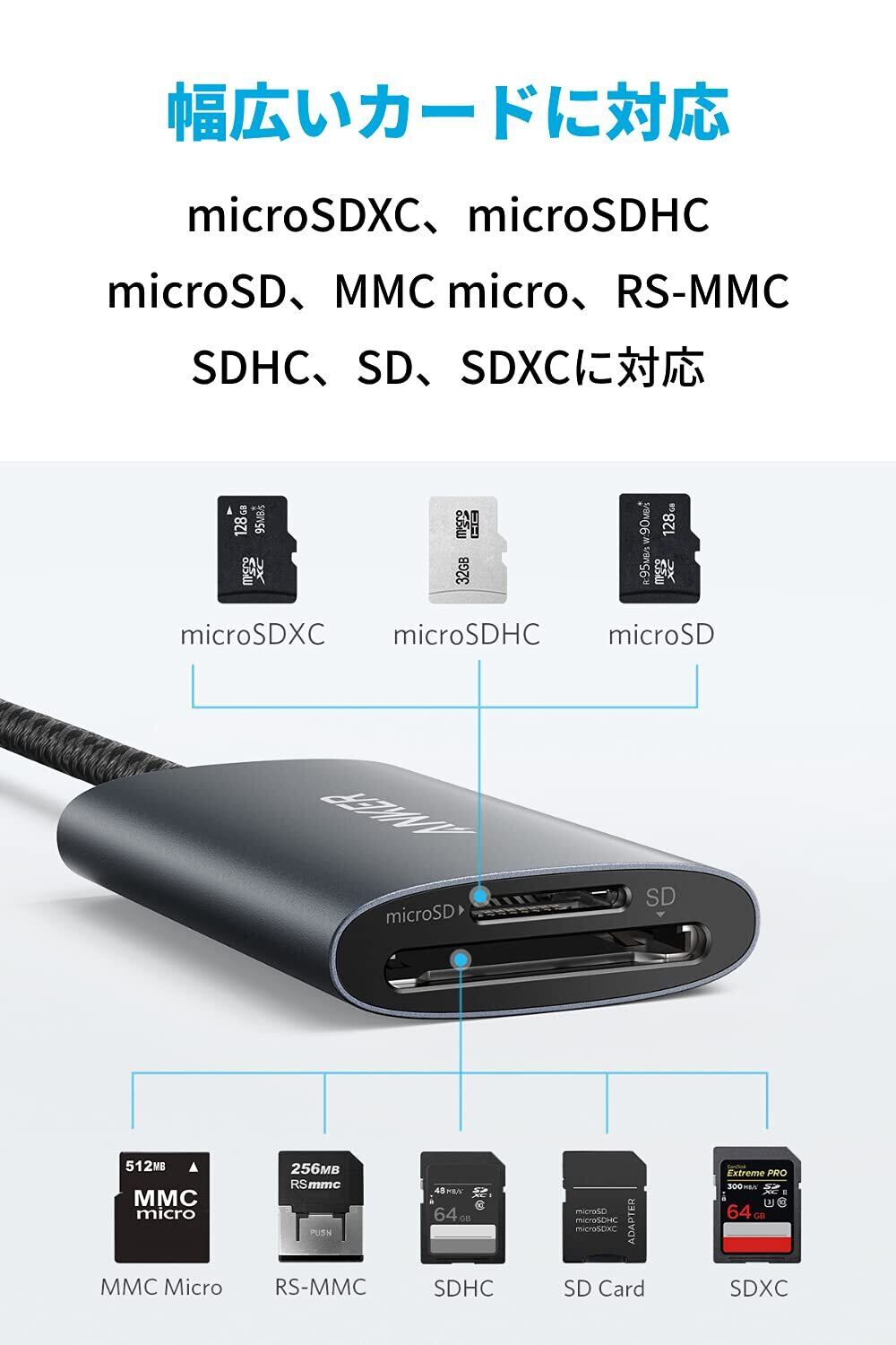 幅広いカードに対応:microSDXC、microSDHC、microSD、MMC micro、RS-MMC、SDHC、SD、SDXCに対応しています。