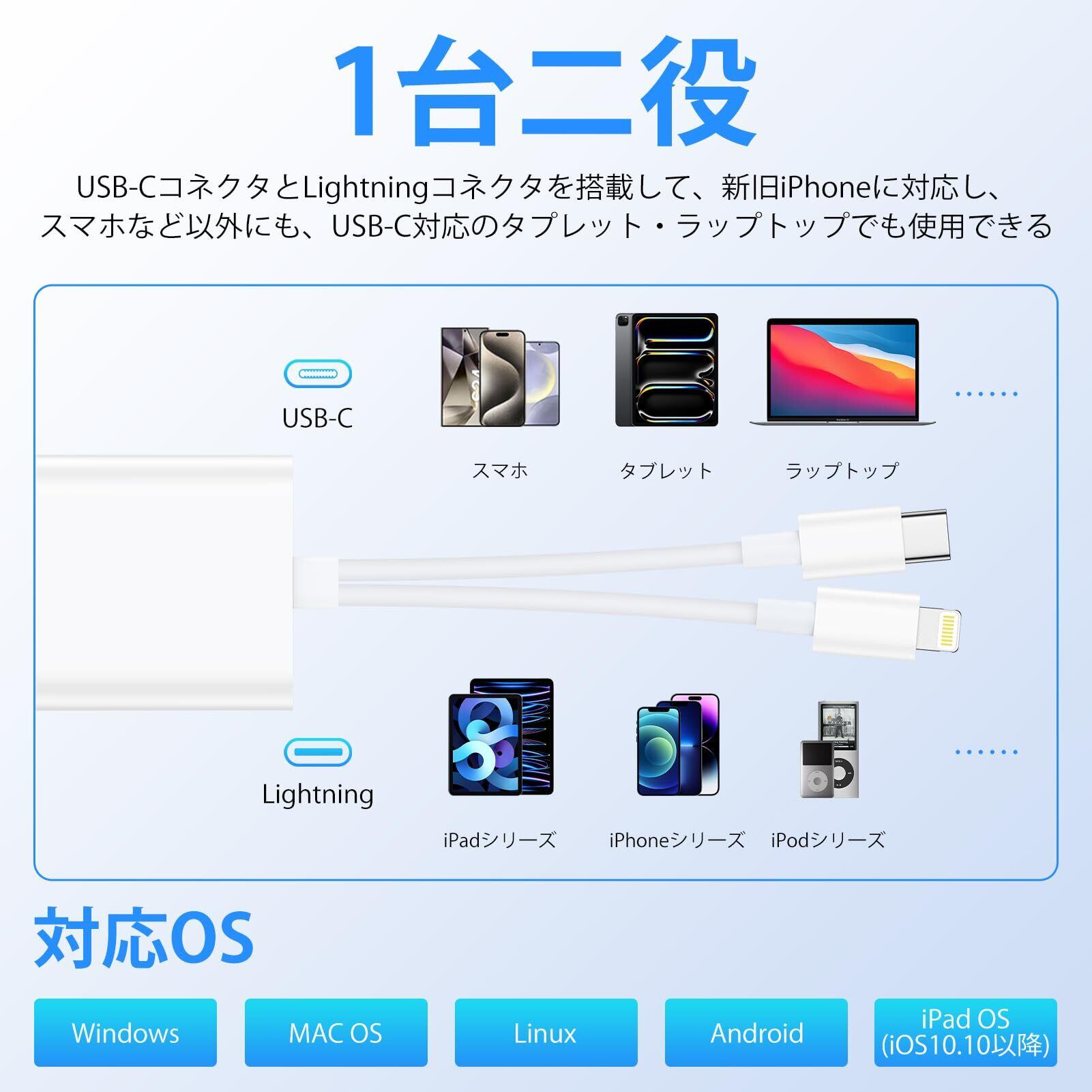 【幅広い互換性&品質】2in1はほぼ全てiPhoneやAndroid機器に対応できます。含むiPhone 14 13 12 11 Pro XR X XS SE,iPad Mini Air Pro(ライトニング)、最新iPhone17/17pro/iPhone16/iPhone16 e/iPhone16 Pro/iPhone16 Pro Max、iPhone 15 Pro Max 15 Plus 15 Pro 15,Samsung Galaxy S25 S24 A15 A14、AQUOS sense8 9、OPPO、Google Pixel、HUAWEI、Xiaomi Mi 15 14、Redmi Note 14 13 Pro (タイプ c )などのデバイスにほとんど対応できます。タブレットから SDカードまで標準の写真フォーマットやJPER、RAW、SD、hdビデオフォーマットに対応しています。 → 安心の12ヶ月つき、万が一、初期不良&破損などが起こった場合は、ぜひ「注文履歴」→「出品者に連絡」から弊店までにご連絡ください(商品の交換・返品サービスなど対応できます)