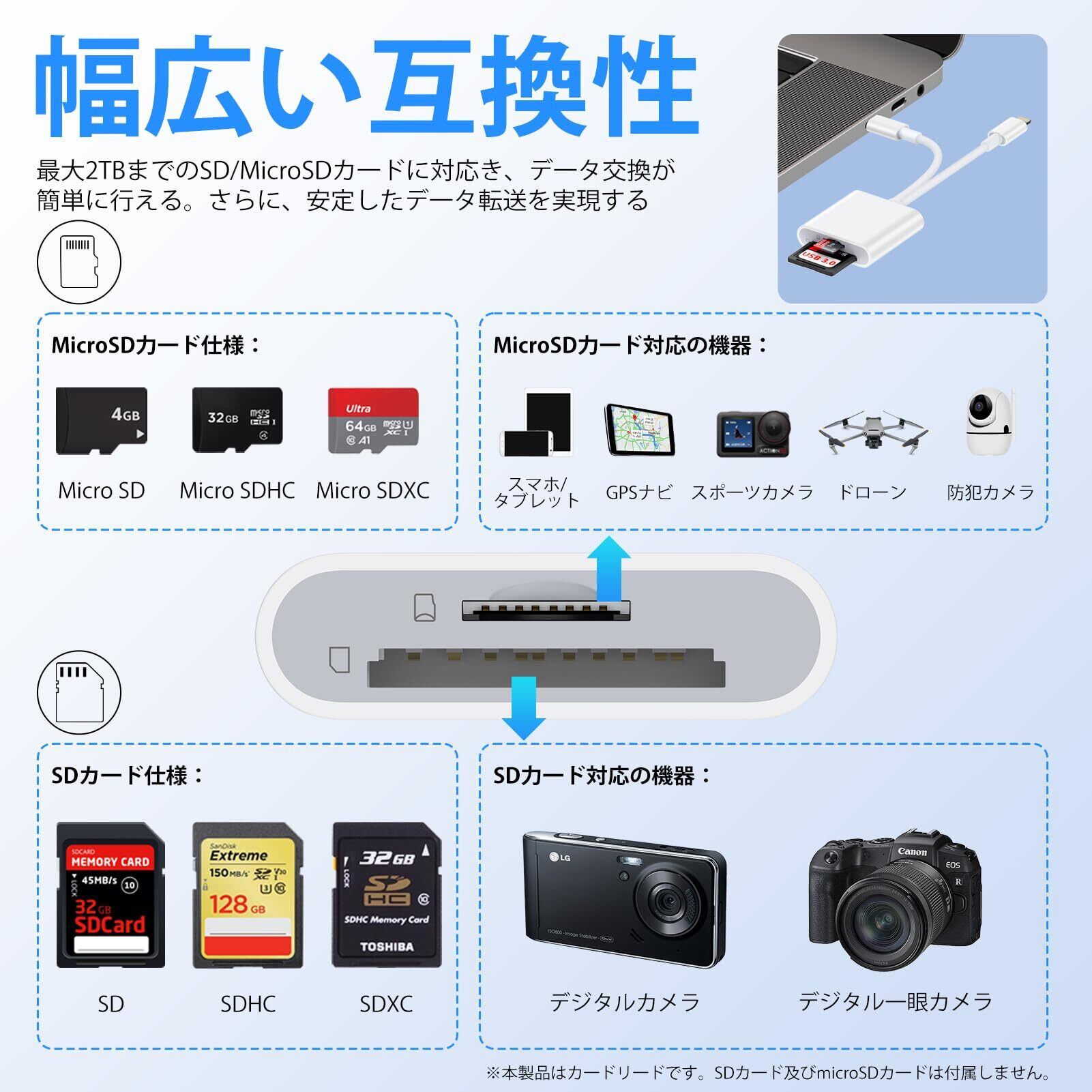 【2 in 1 SDカードリーダー 】:2 in 1 iphone/Andriod SDカードリーダーはTF / SD をサポートします。SDカードポート(SD / SDHC / SDXC / RS-MMC / MMC- Microカード)、TFカードポート(Micro SD / Micro SDHC / Micro SDXCカード))。(**本製品にSD/TFカードは含まれていません。)TF/SDが2TBまでサポート。1本でスマホのストレ一ジ容量不足を解決!ご注意:SD/TFカードリーダーは同時に使用できません。