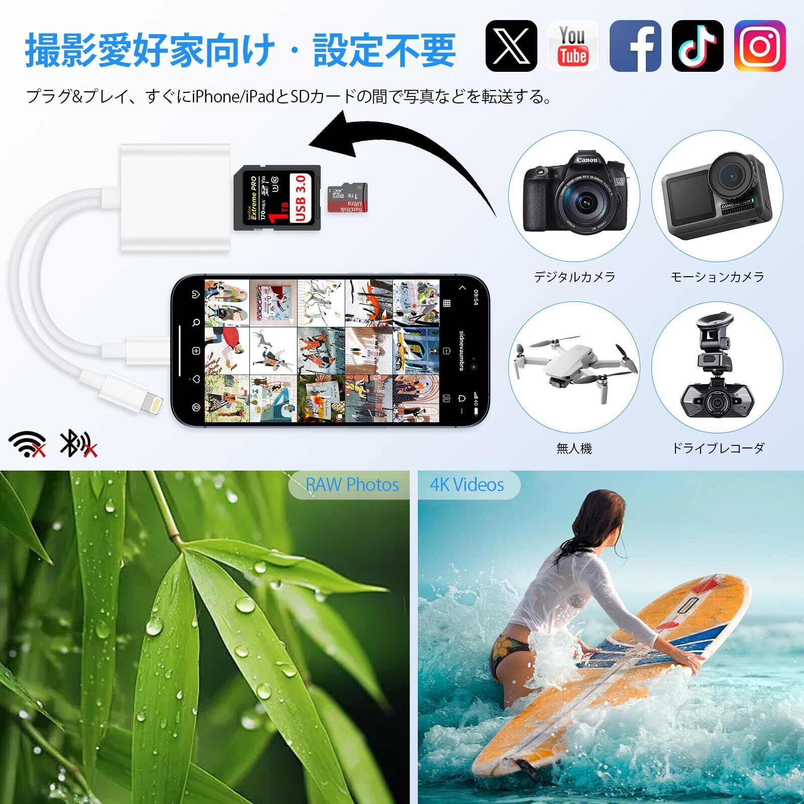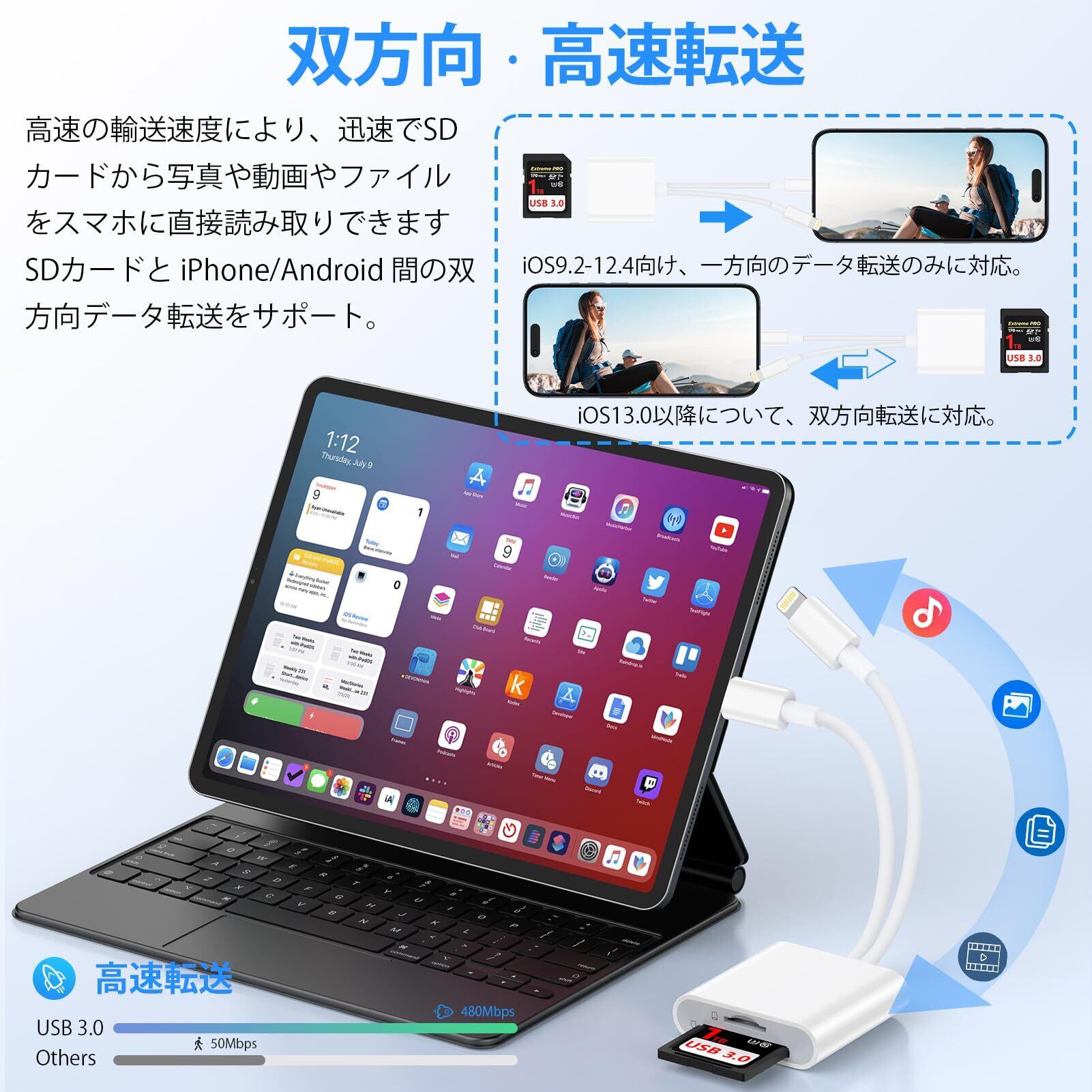 ️【2TBまで大容量カード・双方向高速データ転送】sdカードリーダーは2TBまで大容量カードに対応、新世代チップを採用されたデータケーブルリーダーで、超高速データ転送できる同時に接続された機器をより安全で安定した状態にします。25MB/s~35MB/sのデータ転送スピードで、フォトアルバム、ビデオ、映画などを短時間で転送することができます。双方向:スマホからSD/TFカードへ、SD/TFカードからスマホへ、両方ともサーポートできます。データ転送は速くて簡単! iOS 9.2-12.4バージョンのデバイスはSDカードからiPhone/iPadに転送のみで、iOS13以降のシステムは双方向転送と資料の転送に対応できます。