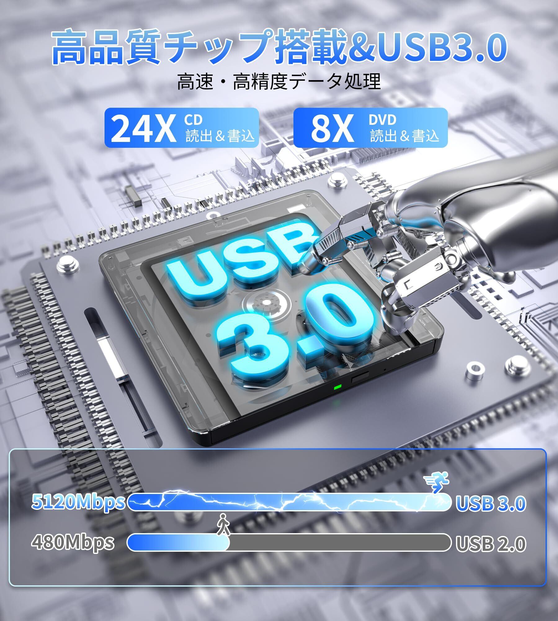 【USB 3.0 & Type-C高速転送・2in1ポート】USB 3.0とType-Cポートをダブル搭載し、最大8XのDVD、24XのCDという驚異的な速読み取り&書き込み速度を実現。USB 2.0と比較して、読み書き速度が大幅に向上し、待ち時間を大幅に短縮。USB3.2(Gen1)/ USB3.0 / USB 2.0/1.1/1.0に互換性にも対応しているため、WindowsやMacなどさまざまなデバイスでストレスなく使用可能。音楽CDの取り込み、映画視聴、大容量データの書き込みも、これ一台で圧倒的に快適。:CDを再生する際は、パソコンに再生ソフトがインストールされているかをご確認ください。インストールされていない場合は、ご自身でダウンロードしていただく必要があります。たとえば、「CyberLink PowerDVD 18」などのプレーヤーは、ほとんどのCD/DVDの再生に対応しています。PC本体のUSB-C端子をマザーボードのUSBポートに接続する必要があります。