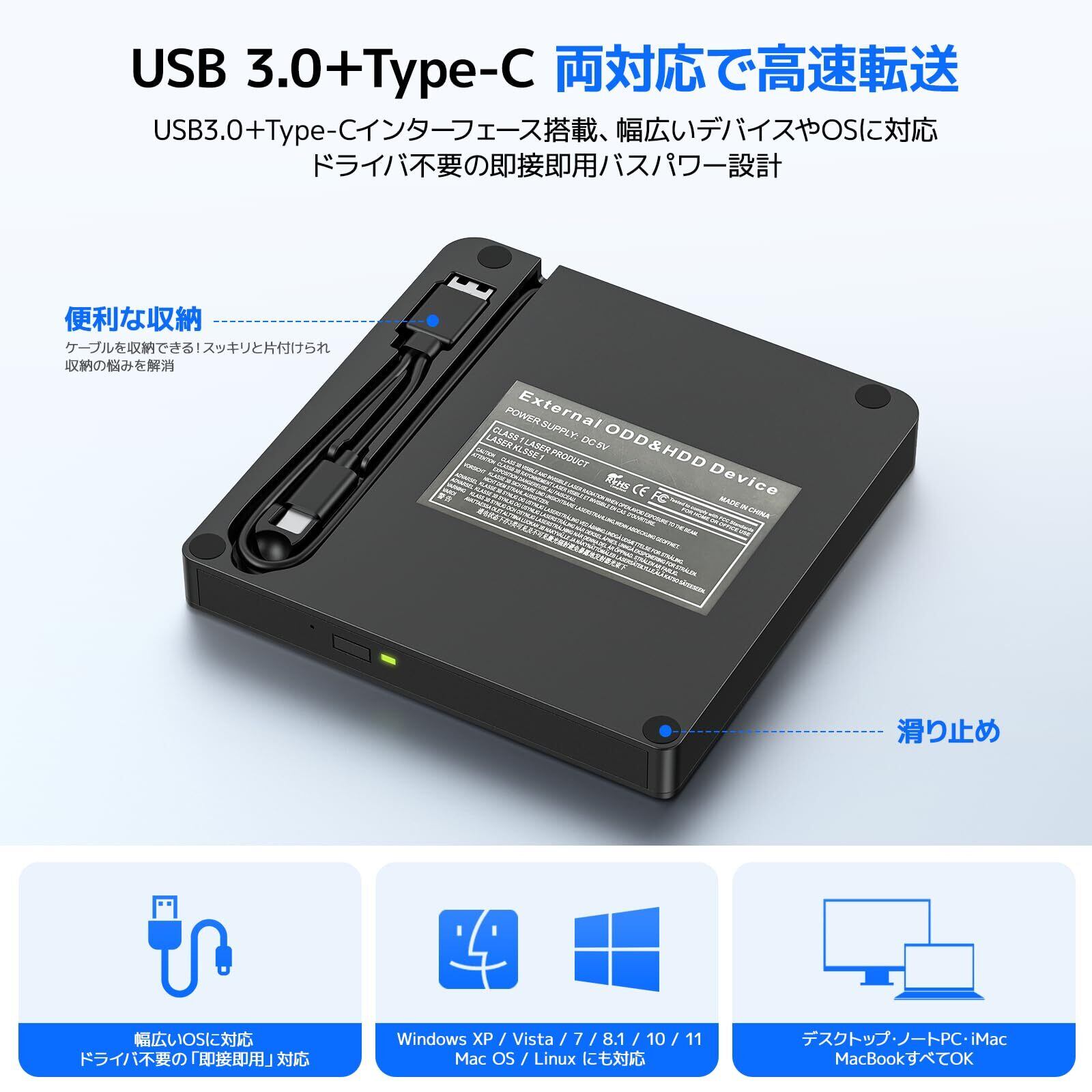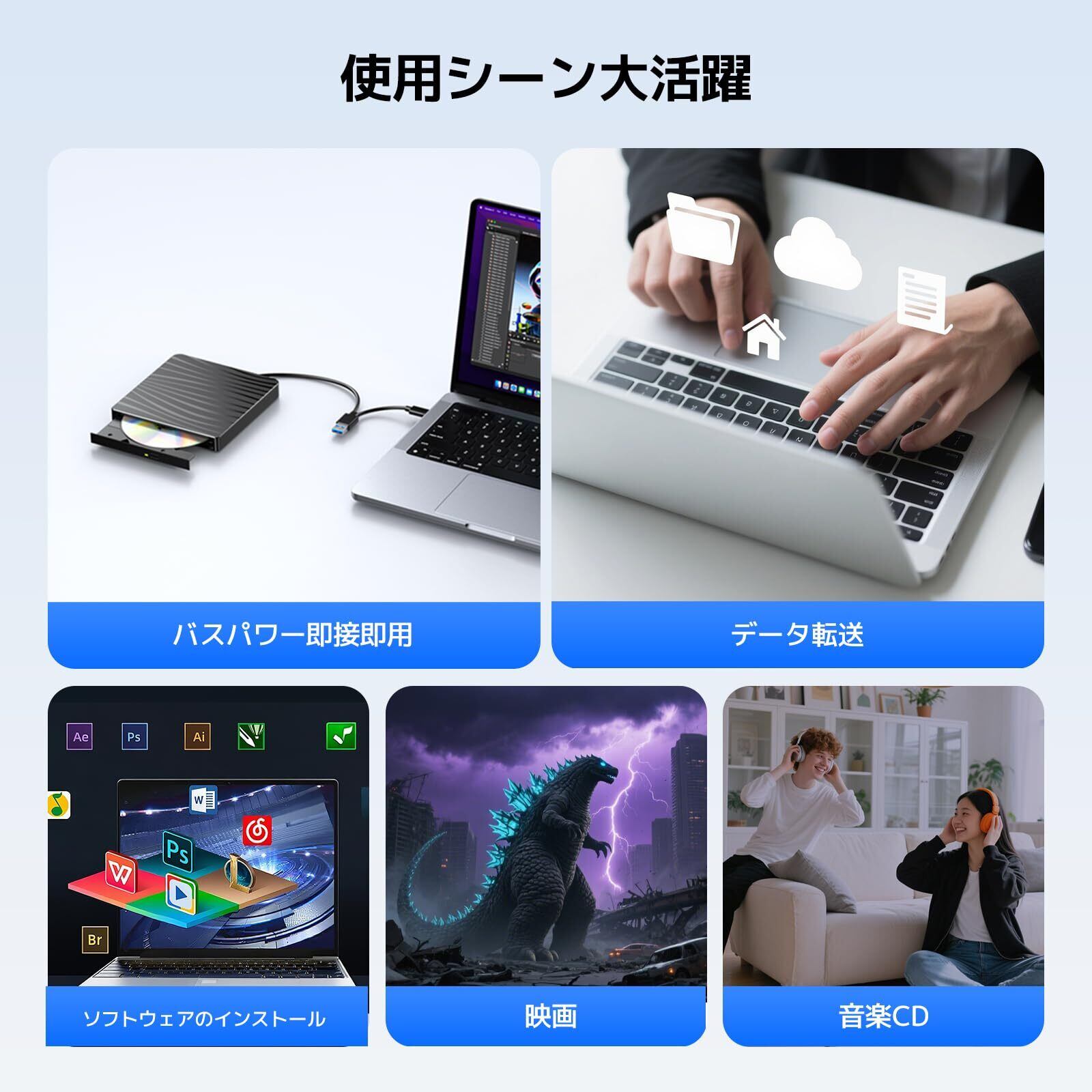 【最新チップで性能向上&快適な操作性を実現】 この外付けCD/DVDドライブは、従来製品に比べて大幅に性能が向上した最新の高性能チップを採用しており、高速かつ安定したデータ処理を実現します。読み取りや書き込みの精度が高く、動画再生やソフトのインストール、データの保存など、さまざまな用途でスムーズな動作が可能です。USB2.0/3.0およびType-Cの両インターフェースに対応しており、WindowsやMacを問わず、多くのデバイスにすぐ接続できます。外部電源やドライバーのインストールは不要で、パソコンに差し込むだけで自動認識されるため、初心者の方でも簡単にご使用いただけます。
