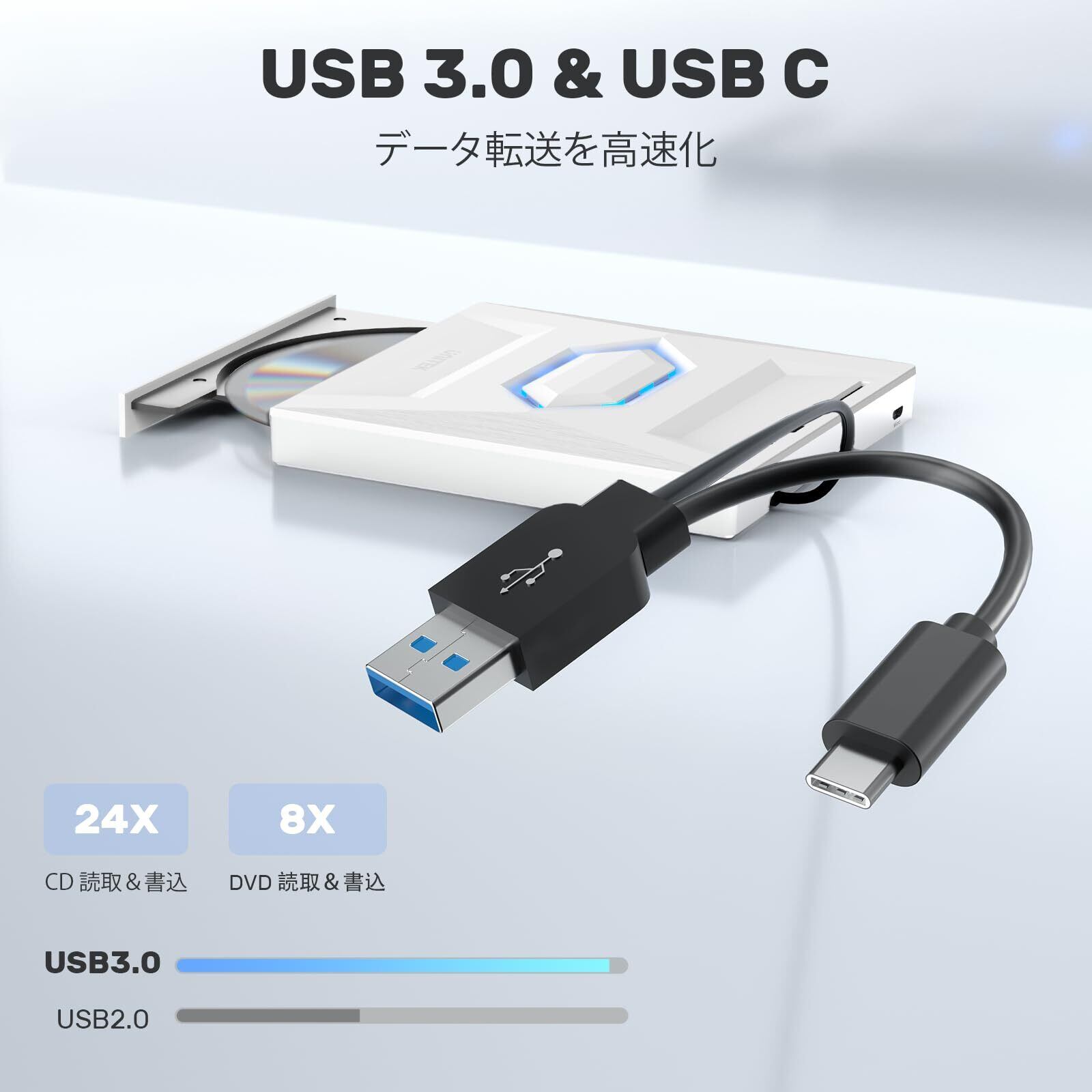 【USB3.0搭載】USBポートあるいはType-Cポートが接続すると、電源がONにして、DVDドライブが自動的に認識されます。USB2.0により約10倍の速度で転送が可能なUSB3.0を搭載した外付けCD/DVDドライブです。高速で転送できて、更にシステム保護機能があり、異常のシャッ夕ダウンによって、デ一夕が紛失される恐れが一切なく!パフォーマンスがより安定し、フォールトトレランスが強化されます。快適な使用体験を与えます。