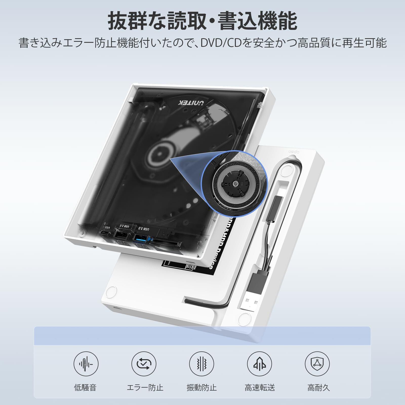 【最新なインテリジェント技術を採用】Unitek外付けdvdドライブはユーニックな知能的インテリジェント記録技術を採用します。CD / DVD-ROM、CD-R / RW、DVD±R / RWをサポートできます。最大8倍の DVD読み取り、8倍のDVD書き込み、24倍のCD読み取りと8倍のCD書き込みスピードを提供、 ファイルの書き込み、ソフトのインストール、ディスクバックアップの作成、DVDムービーの鑑賞などを対応できます。強力なフォールトトレランス、耐衝撃性、ノイズリダクション技術を搭載し、低消費電力。