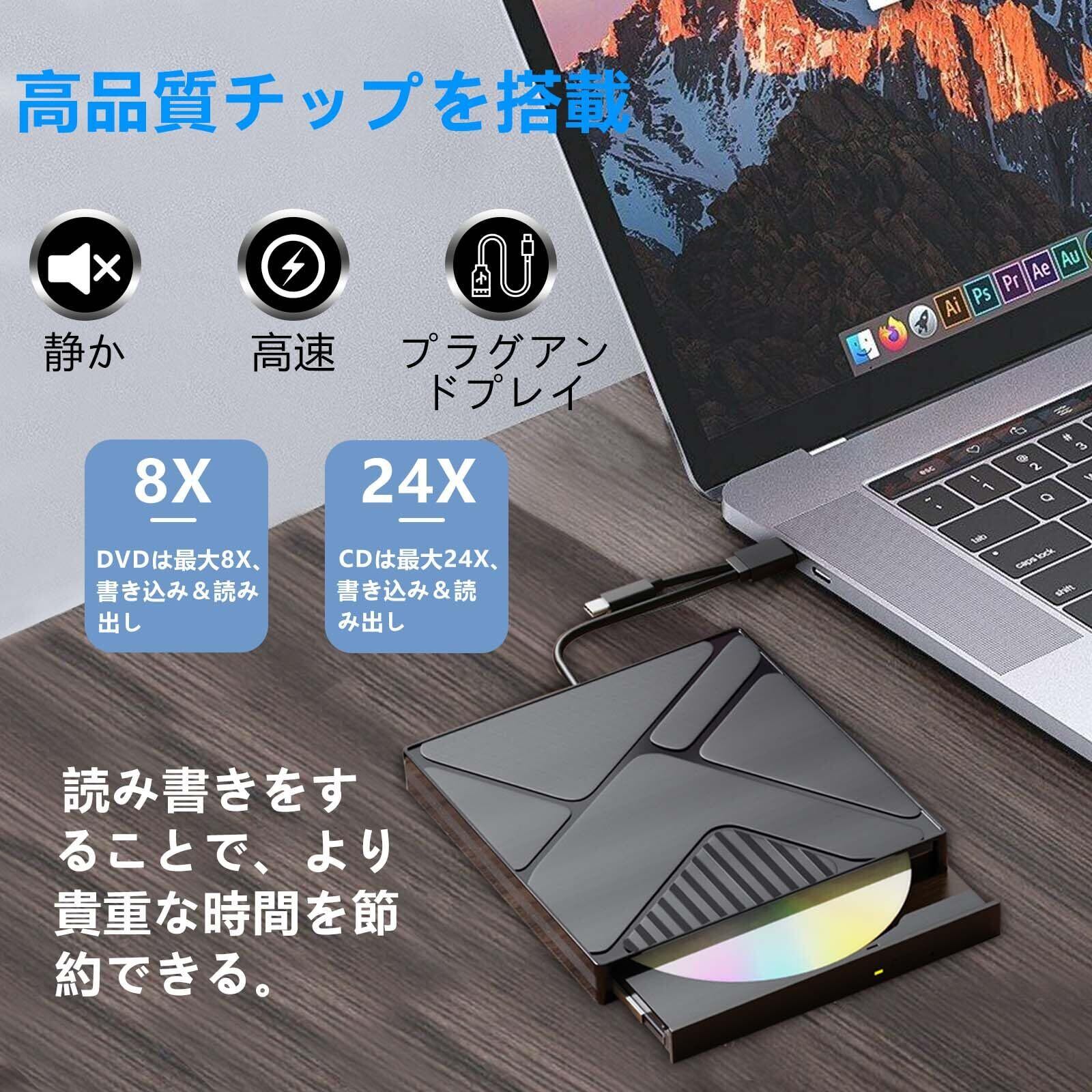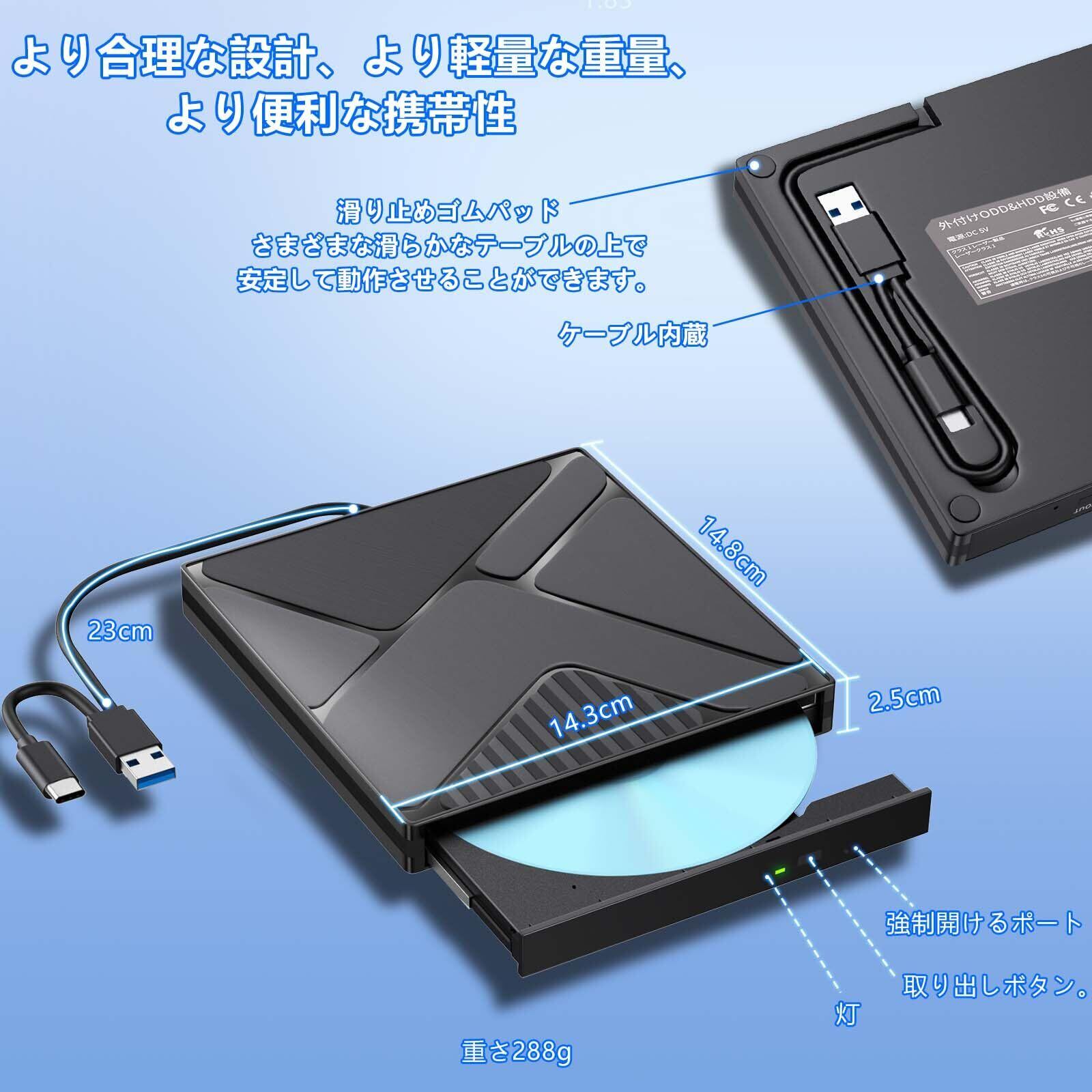CD DVD ドライブ外付け 外付けディスクドライブ 軽量 薄型 静音 パソコン光学ドライブ USB3.0&Type-C両接続デュアルポート 読取/書込可 Windows Mac PC Dell 対応 日本語取扱説明書付き(ブラック)