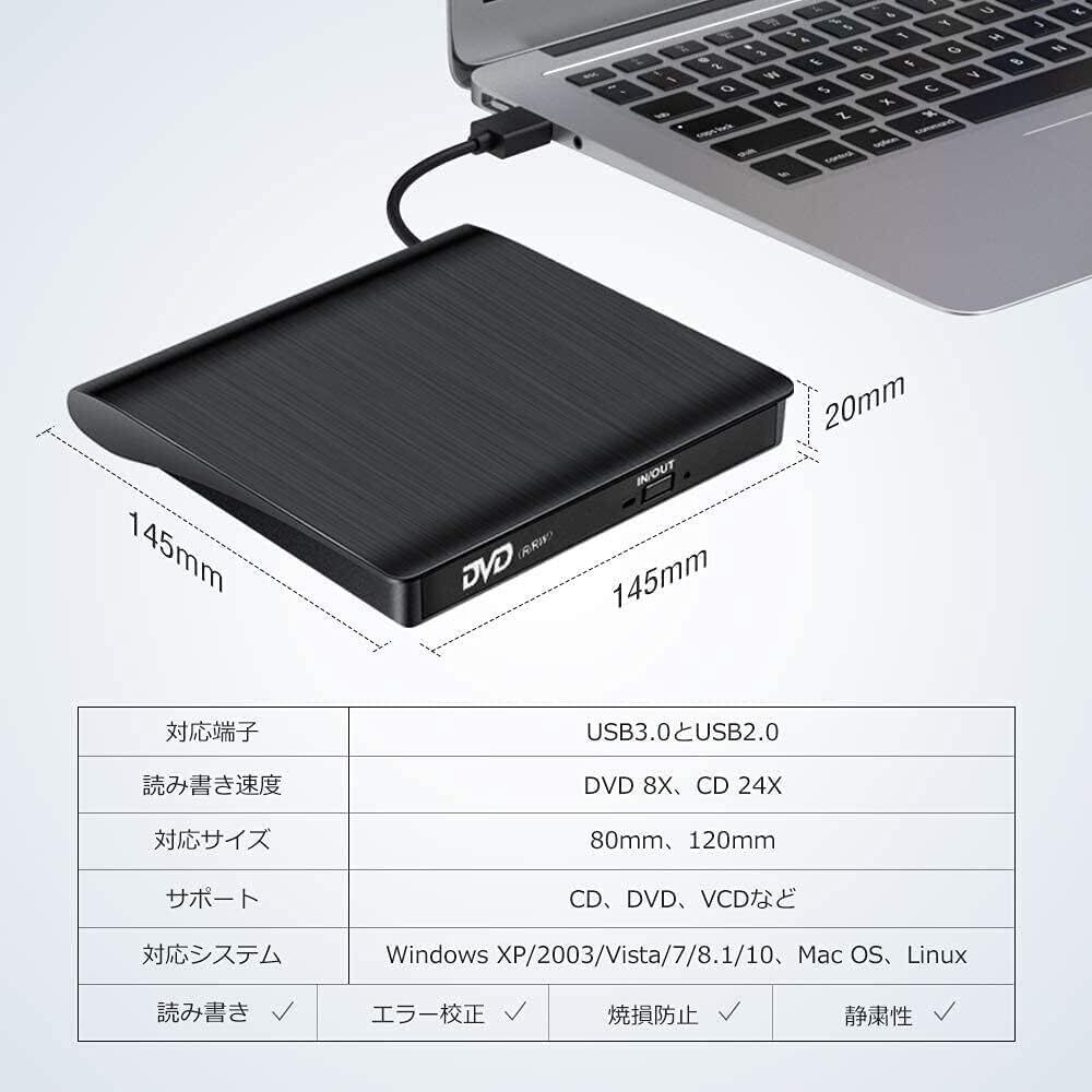 Parishop 外付け DVD ドライブ USB3.0 ポータブルドライブ DVD プレイヤー CD/DVD読取・CD書き込みドライブ Window/Mac OS両対応 高速 静音 超スリム ブラック